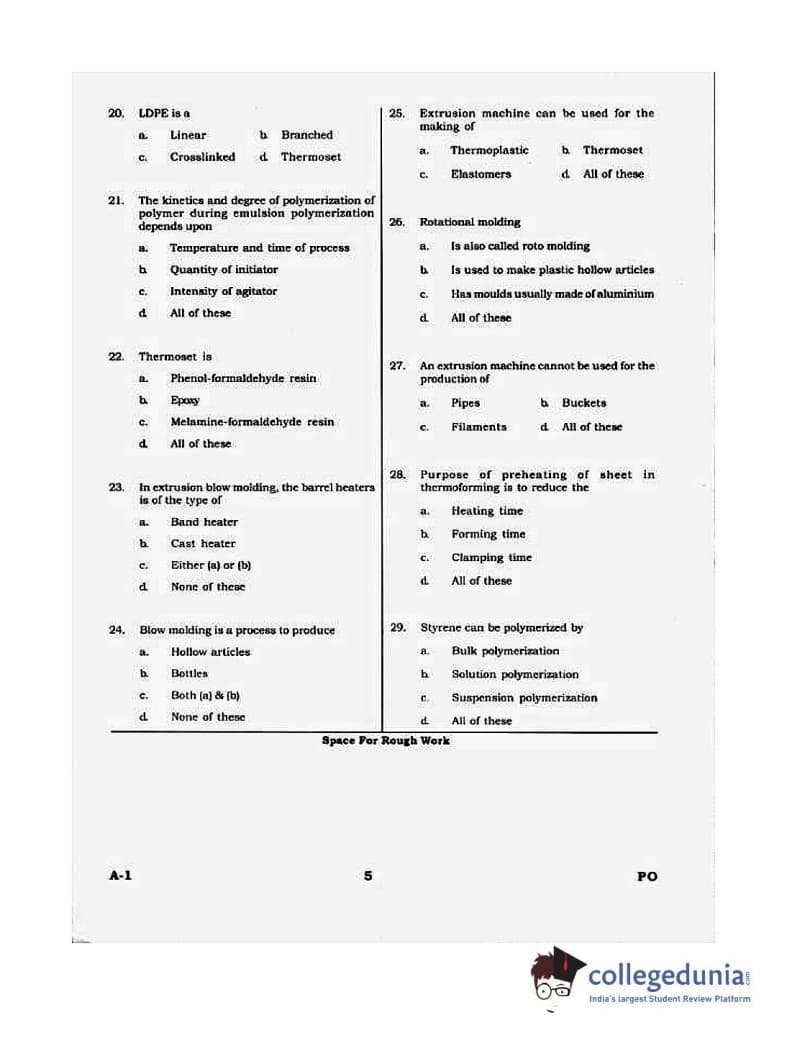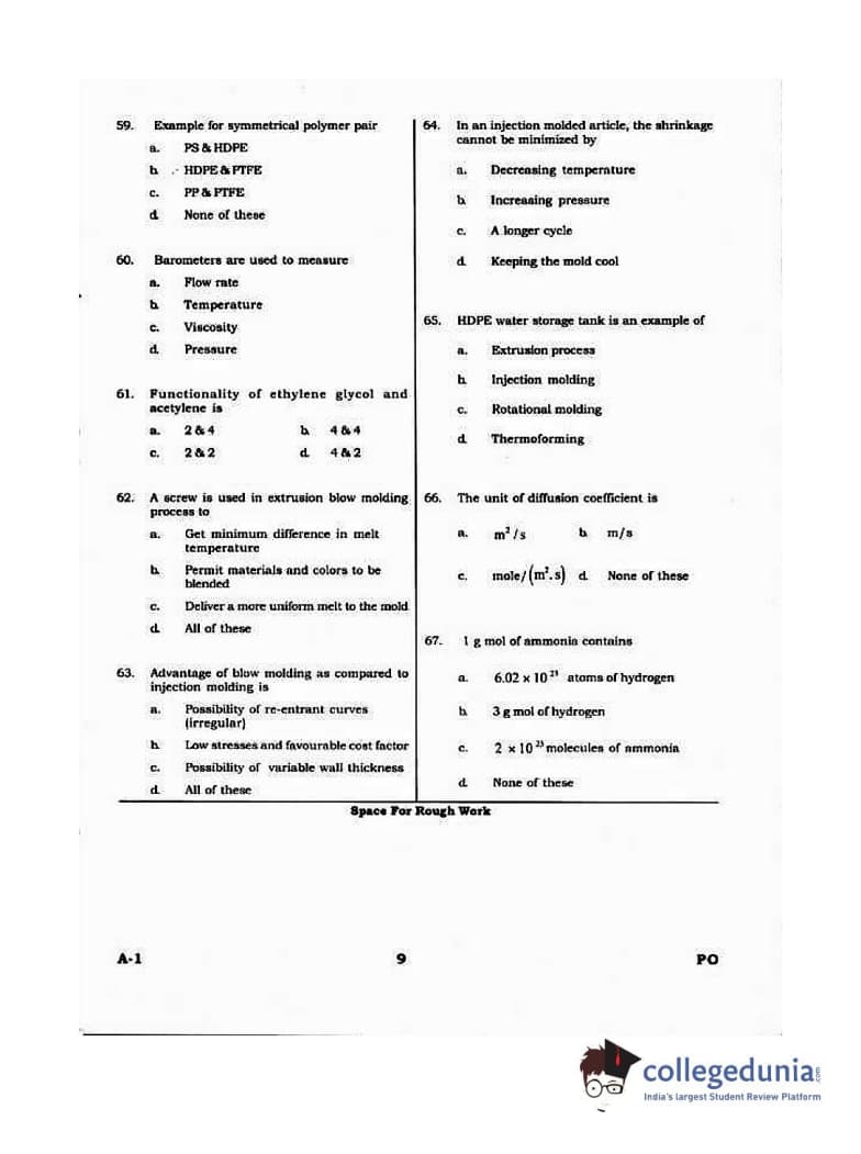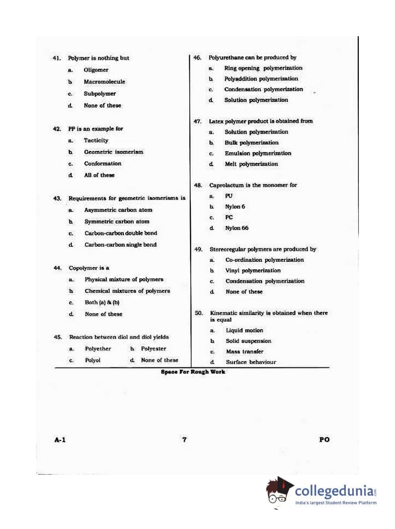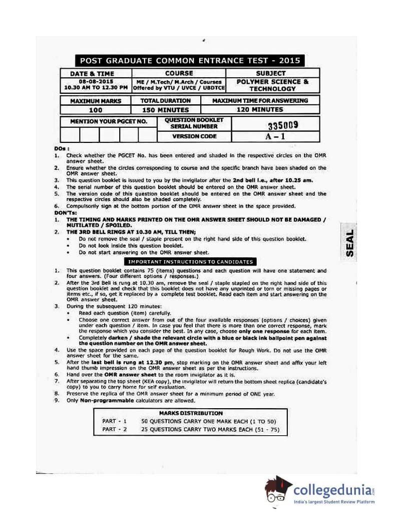Karnataka PGCET 2015 Polymer Science and Technology Question paper with answer key pdf conducted on August 8, 2015 in Morning Session 10:30 AM to 12:30 PM for A-1 is available for download. The exam was successfully organized by Karnataka Examinations Authority (KEA). The question paper comprised a total of 75 questions.