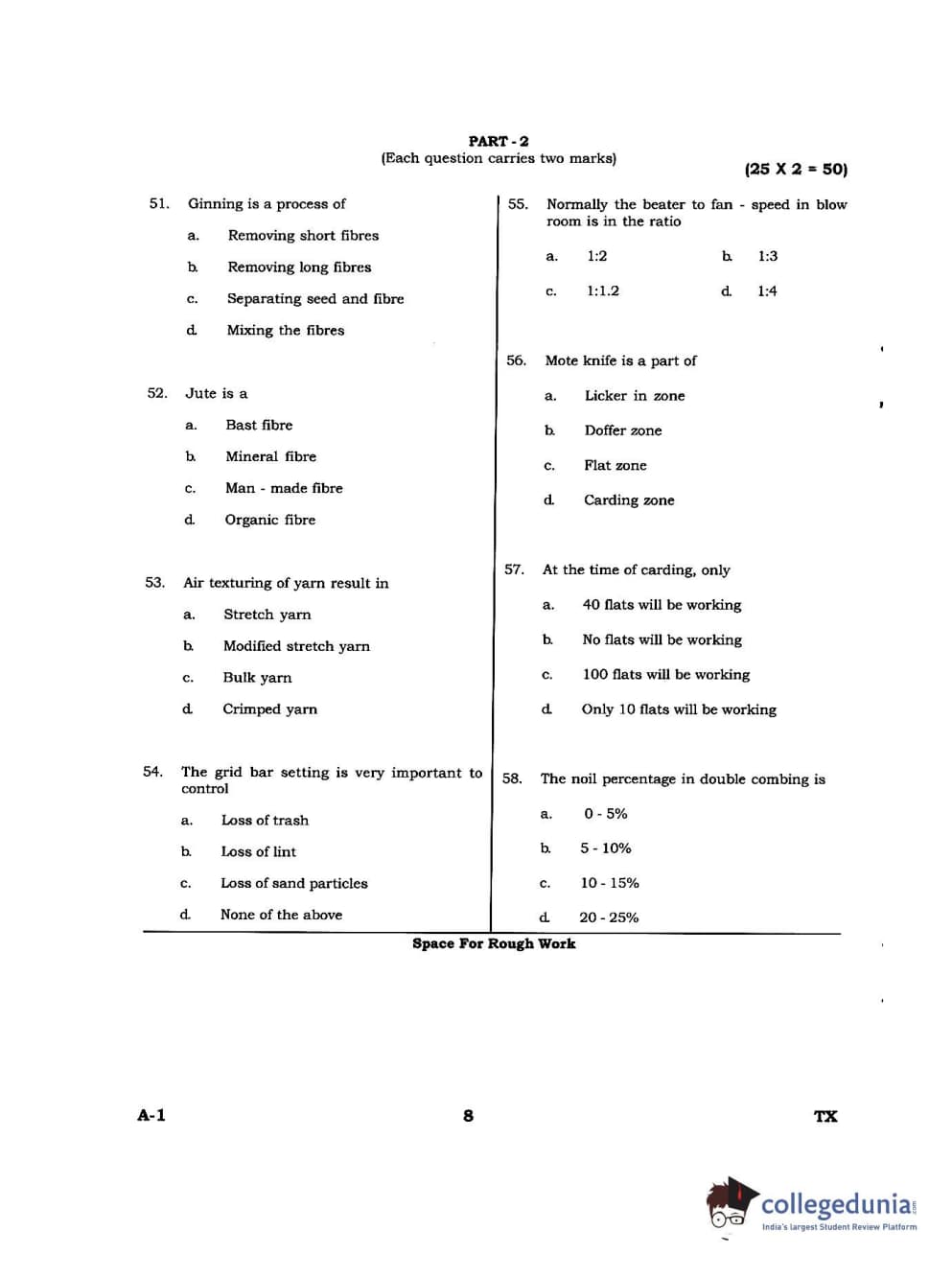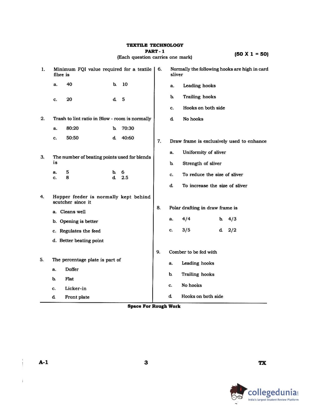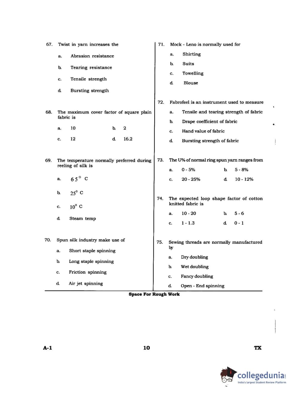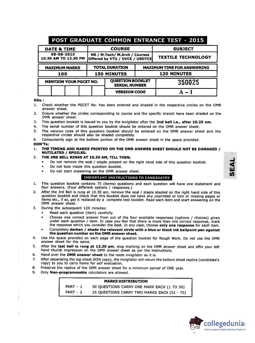Karnataka PGCET 2015 Textile Technology Question paper with answer key pdf conducted on August 8, 2015 in Morning Session 10:30 AM to 12:30 PM for A-1 is available for download. The exam was successfully organized by Karnataka Examinations Authority (KEA). The question paper comprised a total of 75 questions.