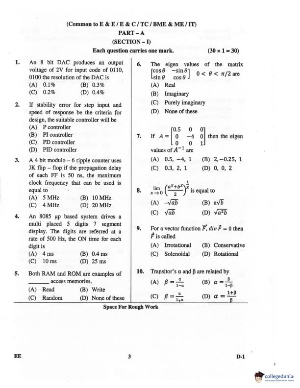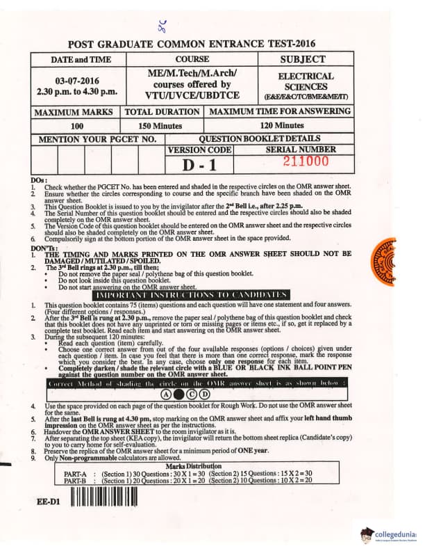 Karnataka PGCET 2016 Electrical Sciences Question paper with answer key pdf conducted on July 3 in Afternoon Session for D-1 is available for download. The exam was successfully organized by Karnataka Examinations Authority (KEA). The question paper comprised a total of 75 questions.
