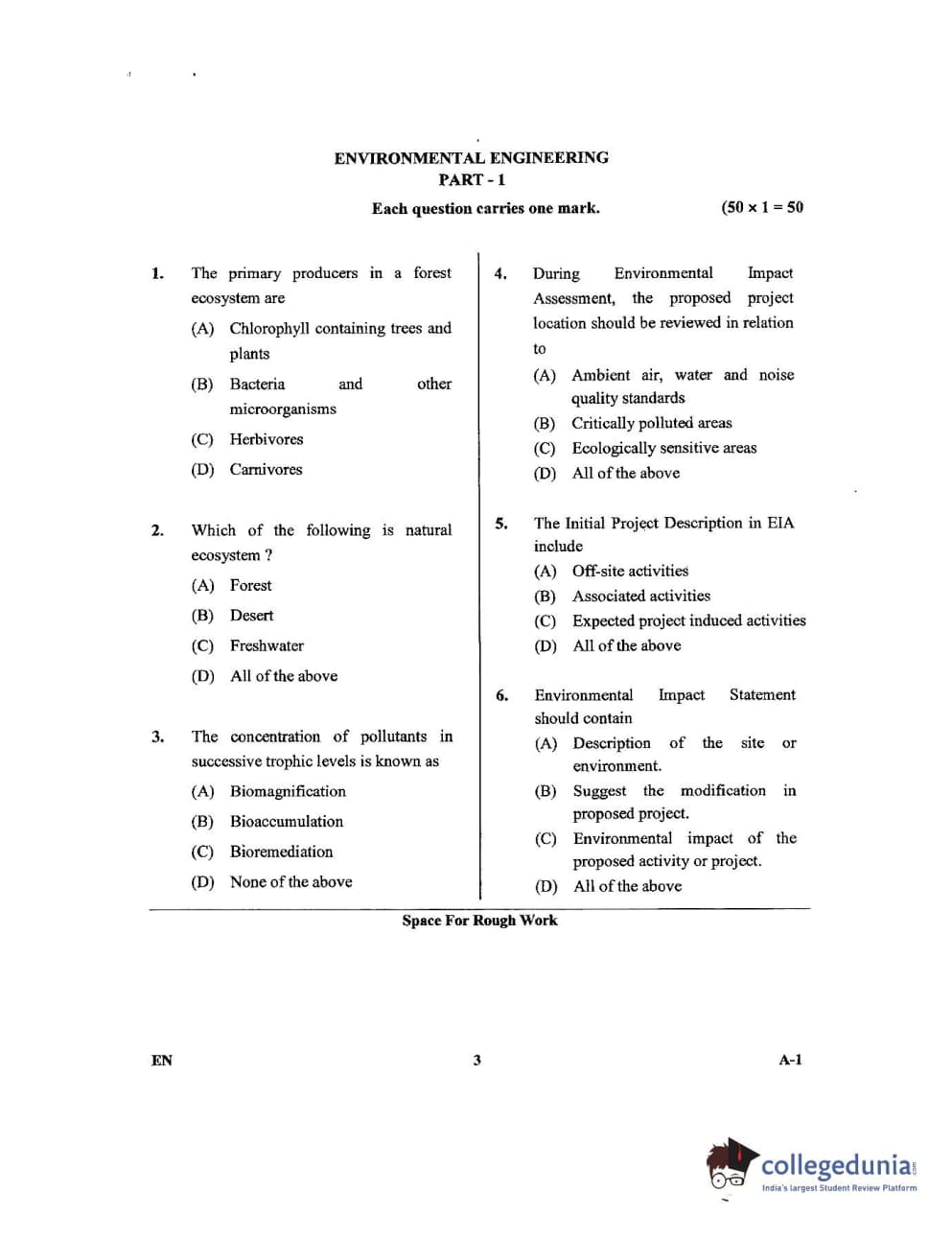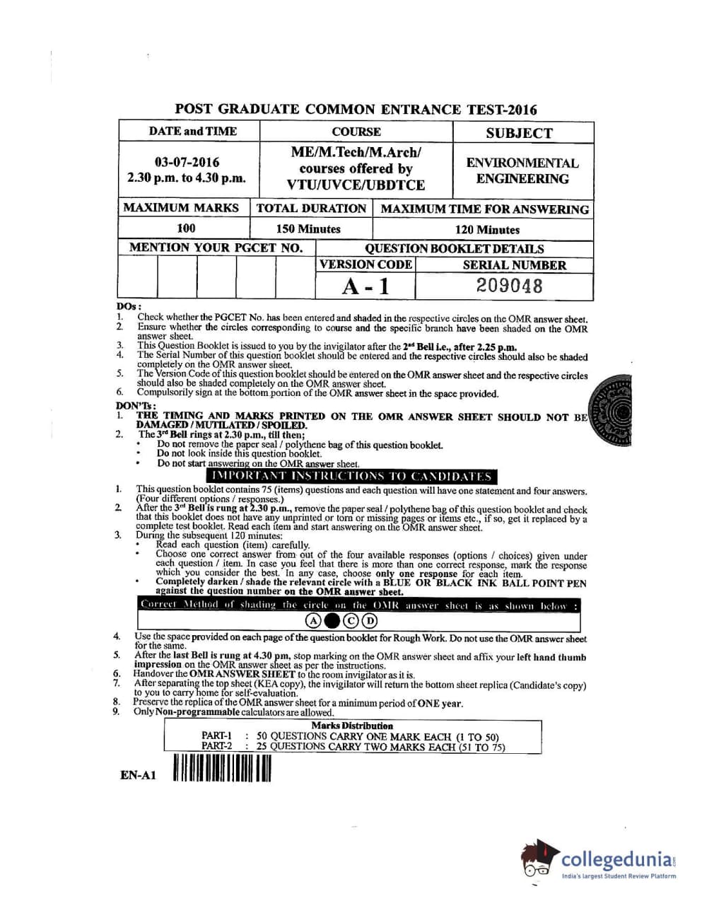 Karnataka PGCET 2016 Environmental Engineering Question paper with answer key pdf conducted on July 3, 2016 in Afternoon Session 2:30 PM to 4:30 PM for A-1 is available for download. The exam was successfully organized by Karnataka Examinations Authority (KEA). The question paper comprised a total of 75 questions.