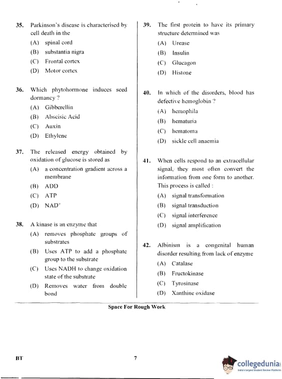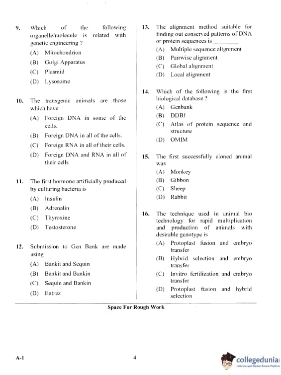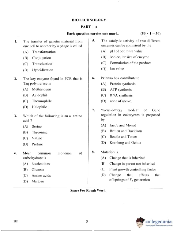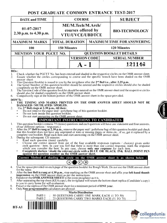 Karnataka PGCET 2017 Biotechnology Question paper with answer key pdf conducted on July 1, 2017 in Afternoon Session 2:30 PM to 4:30 PM for A-1 is available for download. The exam was successfully organized by Karnataka Examinations Authority (KEA). The question paper comprised a total of 75 questions.