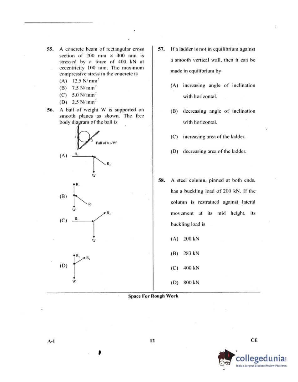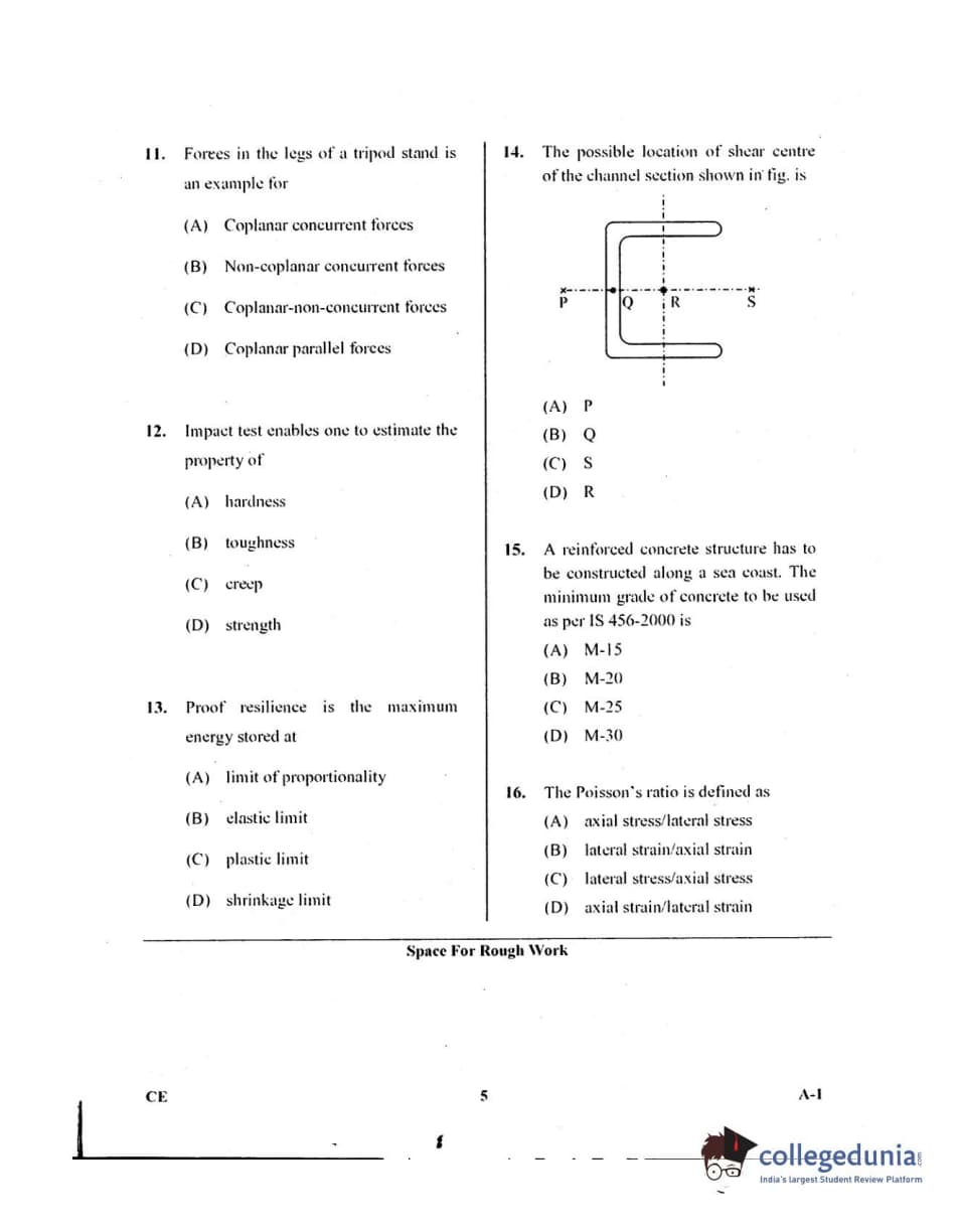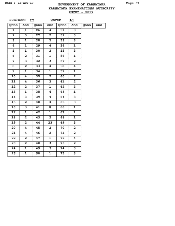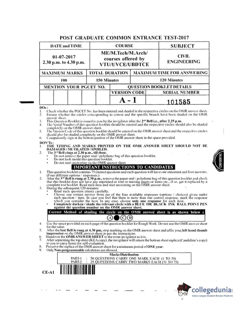Karnataka PGCET 2017 Civil Engineering Question paper with answer key pdf conducted on July 1, 2017 in Afternoon Session 2:30 PM to 4:30 PM for A-1 is available for download. The exam was successfully organized by Karnataka Examinations Authority (KEA). The question paper comprised a total of 75 questions.
