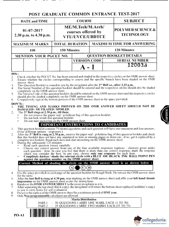 Karnataka PGCET 2017 Polymer Science and Technology Question paper with answer key pdf conducted on July 1, 2017 in Afternoon Session 2:30 PM to 4:30 PM for A-1 is available for download. The exam was successfully organized by Karnataka Examinations Authority (KEA). The question paper comprised a total of 75 questions.