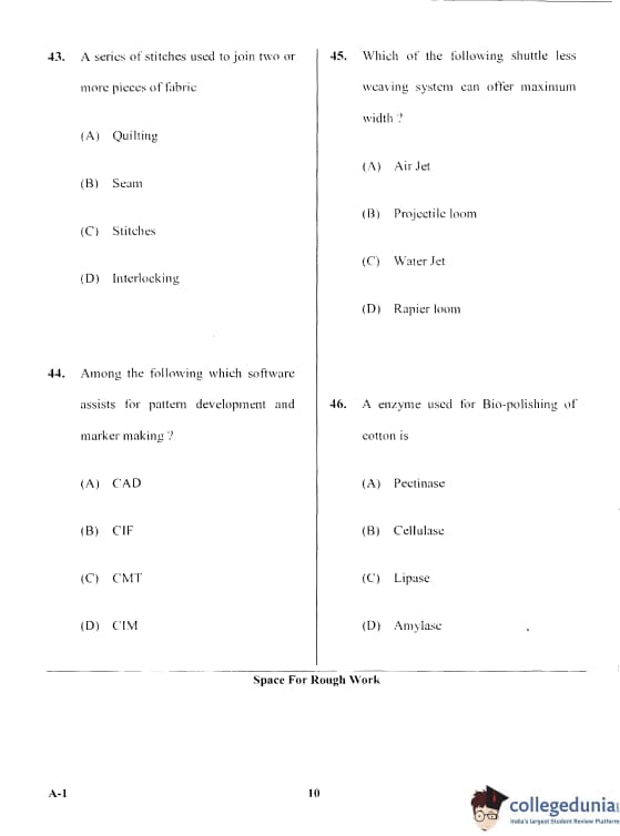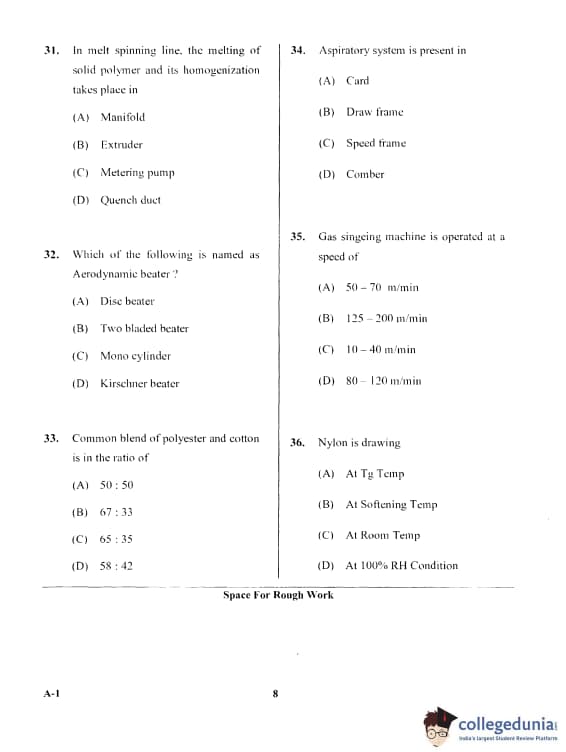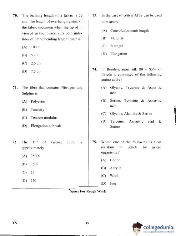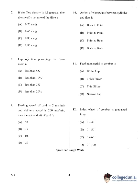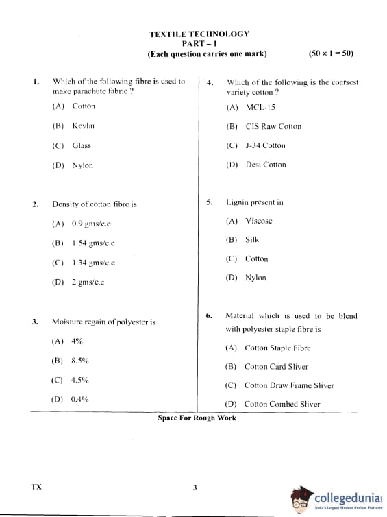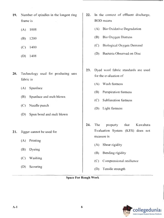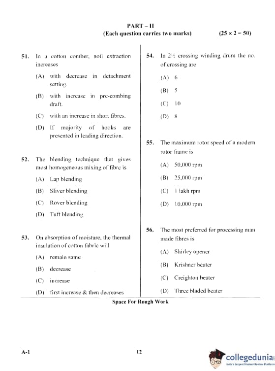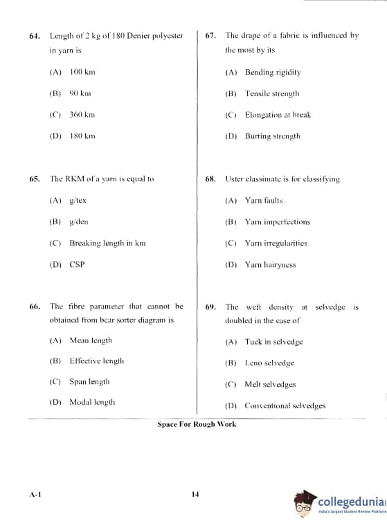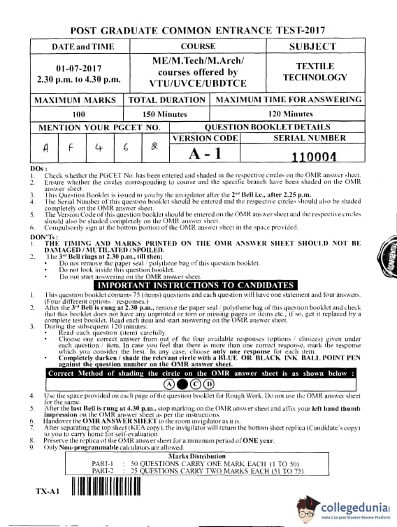 Karnataka PGCET 2017 Textile Technology Question paper with answer key pdf conducted on July 1, 2017 in Afternoon Session 2:30 PM to 4:30 PM for A-1 is available for download. The exam was successfully organized by Karnataka Examinations Authority (KEA). The question paper comprised a total of 75 questions.