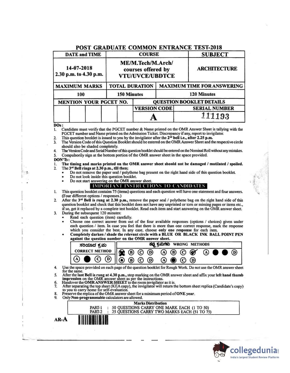 Karnataka PGCET 2018 Architecture Question paper with answer key pdf conducted on July 14, 2018 in Afternoon Session 2:30 PM to 4:30 PM for A is available for download. The exam was successfully organized by Karnataka Examinations Authority (KEA). The question paper comprised a total of 75 questions.