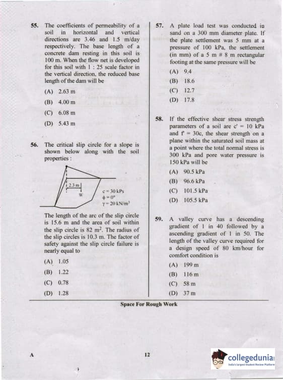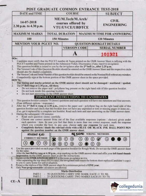 Karnataka PGCET 2018 Civil Engineering Question paper with answer key pdf conducted on July 14, 2018 in Afternoon Session 2:30 PM to 4:30 PM for A is available for download. The exam was successfully organized by Karnataka Examinations Authority (KEA). The question paper comprised a total of 75 questions.