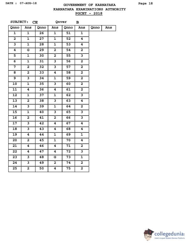 | Karnataka PGCET 2018 Civil Engineering Question Paper PDF | Karnataka PGCET 2018 Civil Engineering Answer Key PDF |