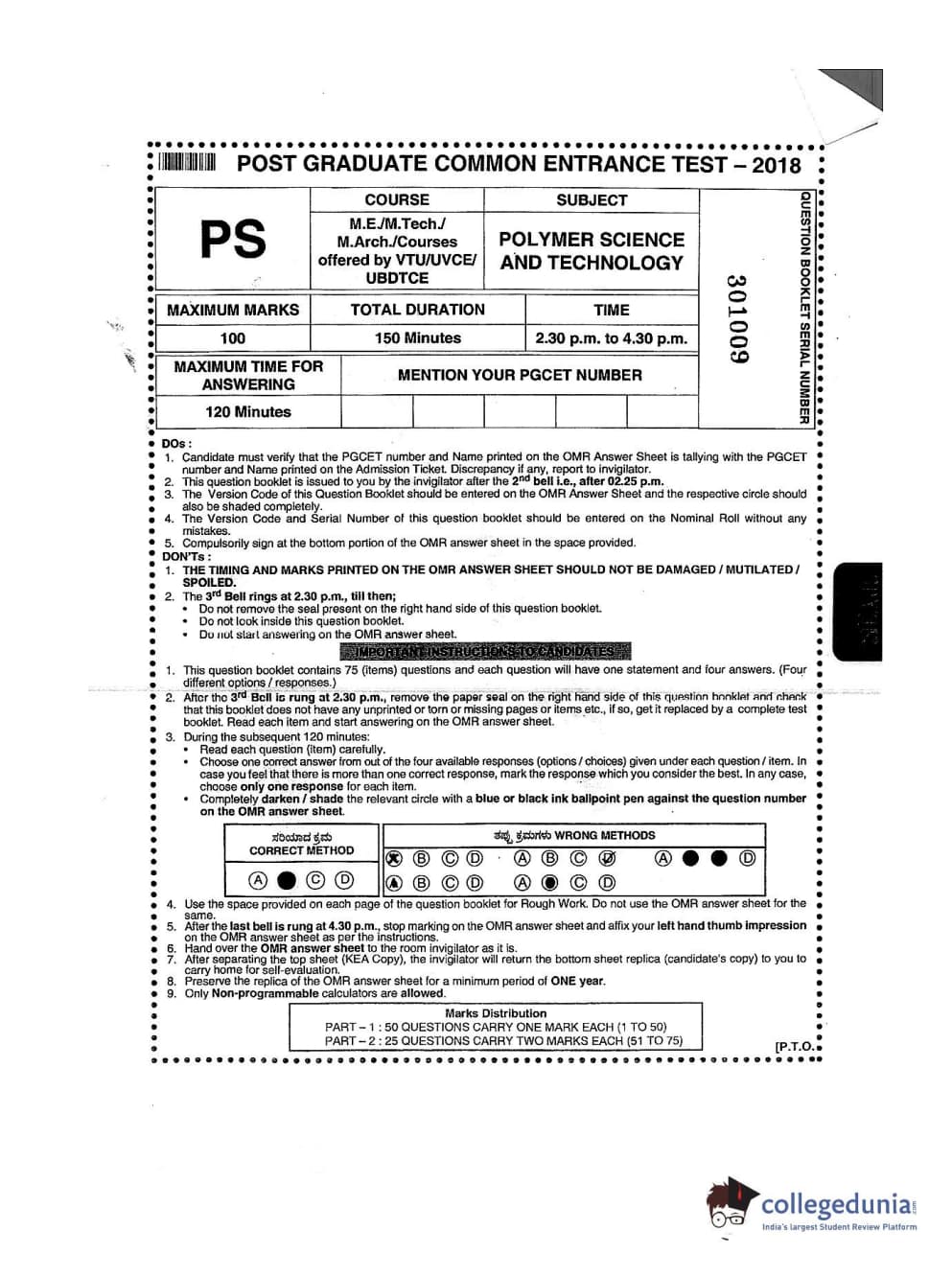 Karnataka PGCET 2018 Polymer Science and Technology Question paper with answer key pdf conducted on July 14, 2018 in Afternoon Session 2:30 PM to 4:30 PM is available for download. The exam was successfully organized by Karnataka Examinations Authority (KEA). The question paper comprised a total of 75 questions.
