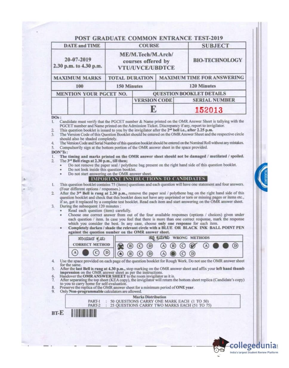 Karnataka PGCET 2019 Biotechnology Question paper with answer key pdf conducted on July 20, 2019 in Afternoon Session 2:30 PM to 4:30 PM for E is available for download. The exam was successfully organized by Karnataka Examinations Authority (KEA). The question paper comprised a total of 75 questions.