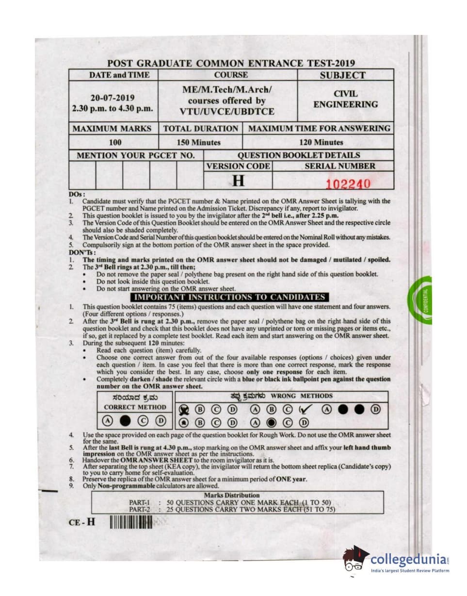 Karnataka PGCET 2019 Civil Engineering Question paper with answer key pdf conducted on July 20, 2019 in Afternoon Session 2:30 PM to 4:30 PM for H is available for download. The exam was successfully organized by Karnataka Examinations Authority (KEA). The question paper comprised a total of 75 questions.