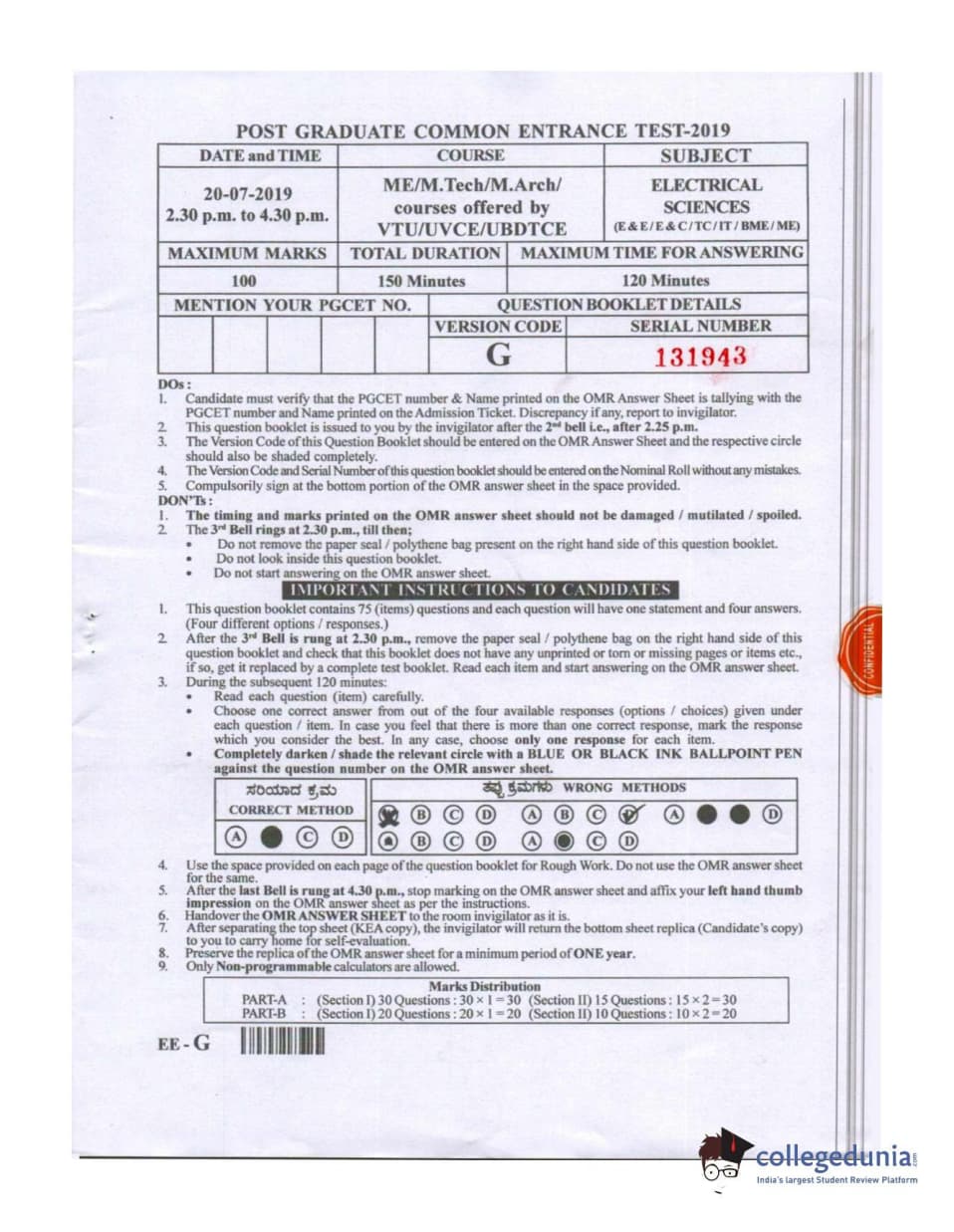 Karnataka PGCET 2019 Electrical Sciences Question paper with answer key pdf conducted on July 20, 2019 in Afternoon Session 2:30 PM to 4:30 PM for G is available for download. The exam was successfully organized by Karnataka Examinations Authority (KEA). The question paper comprised a total of 75 questions.