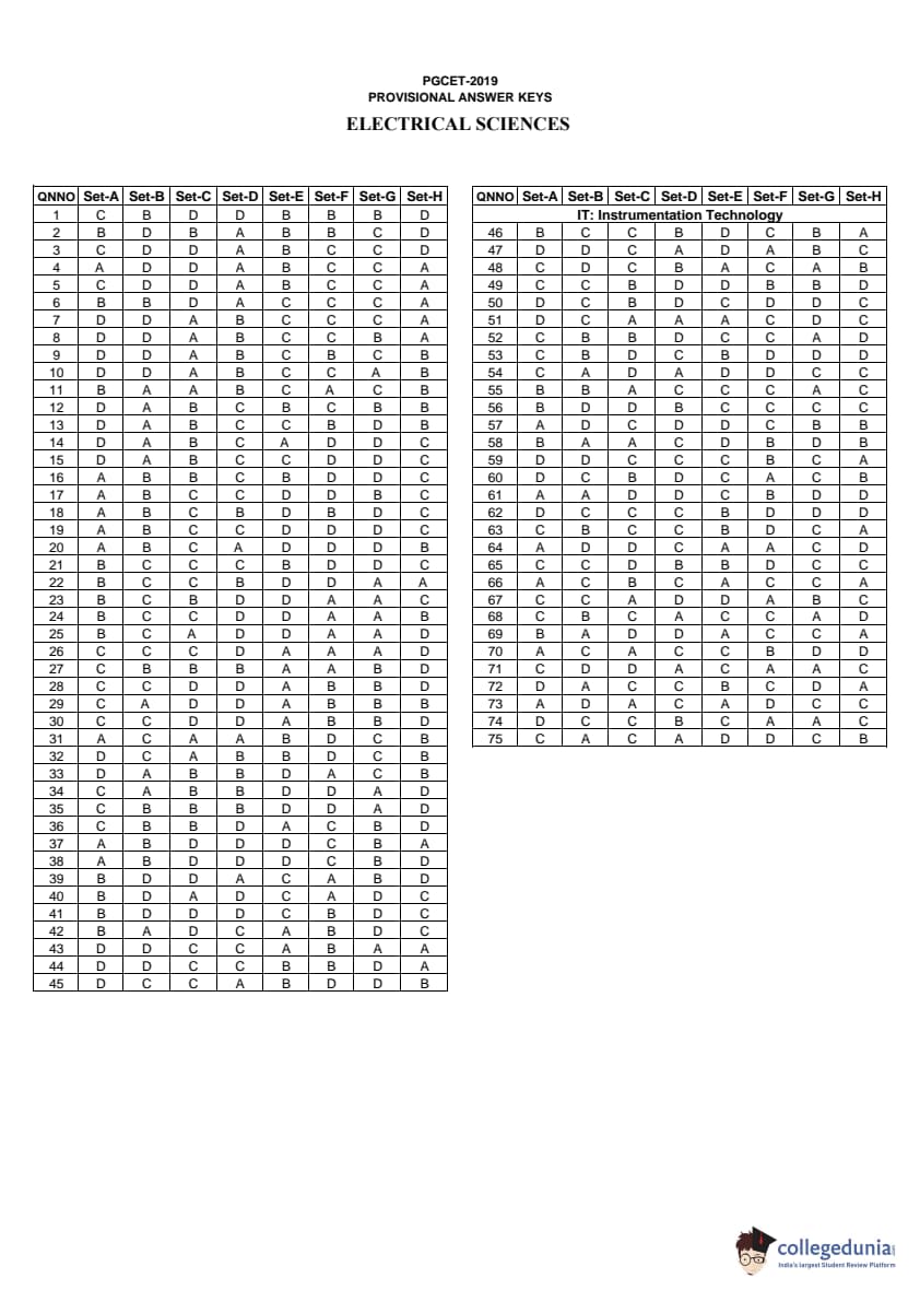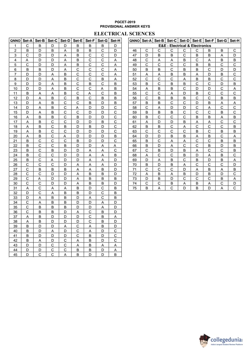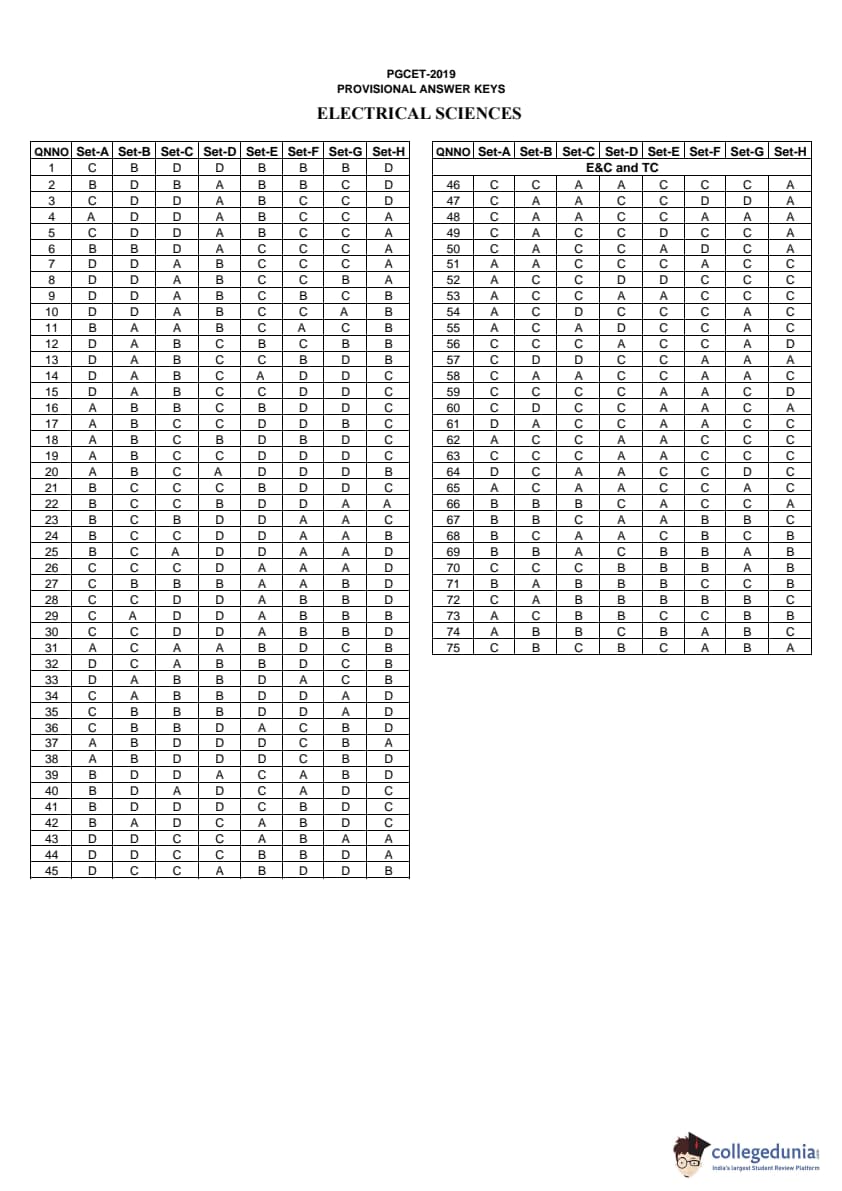 | Karnataka PGCET 2019 Electrical Sciences Question Paper PDF | Karnataka PGCET 2019 Electrical Sciences Answer Key PDF |