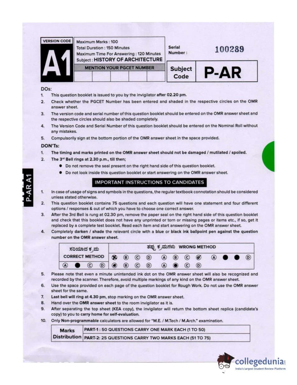 Karnataka PGCET 2020 Architecture Question paper with answer key pdf conducted on October 13, 2020 in Afternoon Session 2:30 PM to 4:30 PM for A-1 is available for download. The exam was successfully organized by Karnataka Examinations Authority (KEA). The question paper comprised a total of 75 questions.