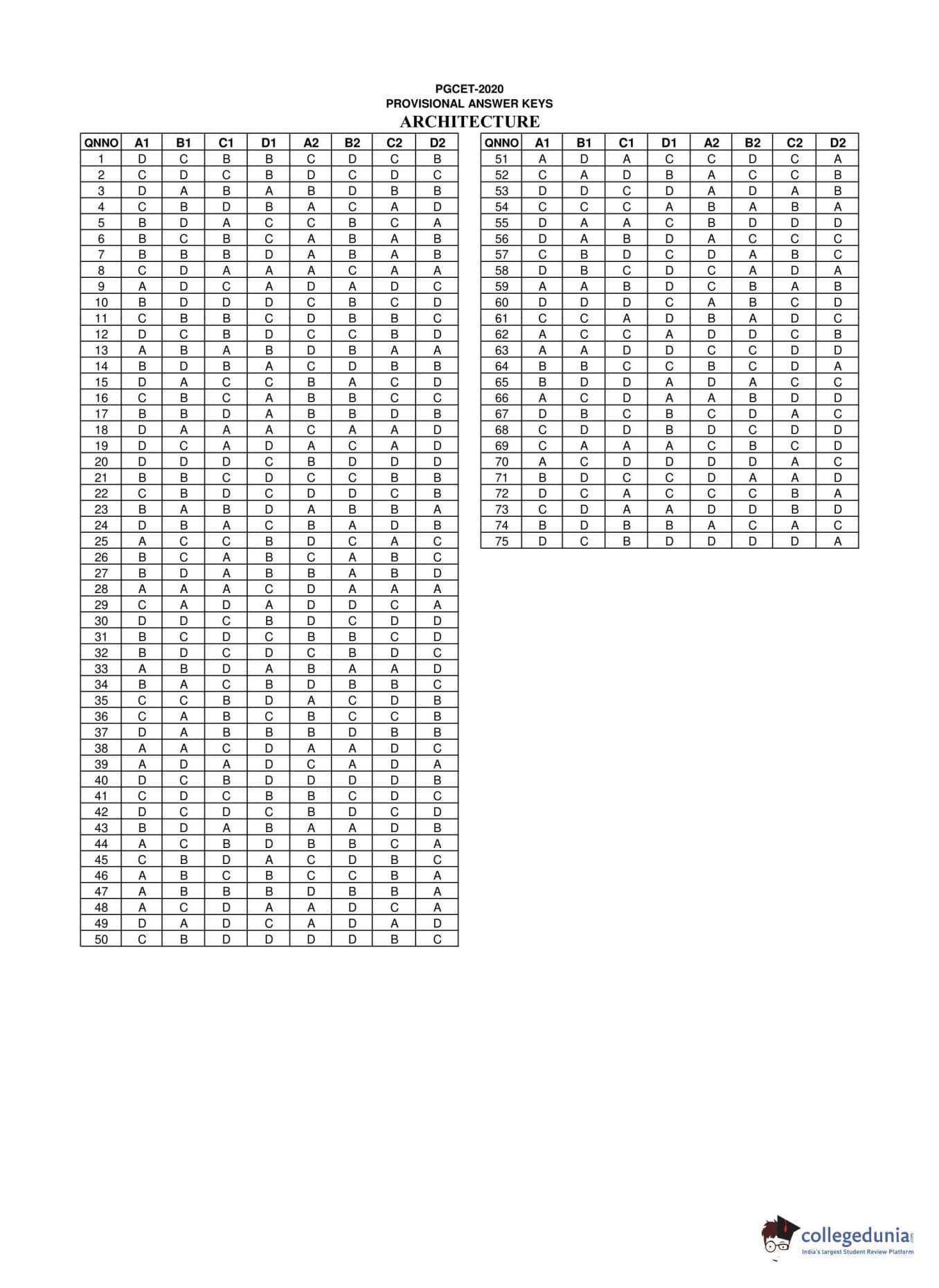 | Karnataka PGCET 2020 Architecture Question Paper PDF | Karnataka PGCET 2020 Architecture Answer Key PDF |