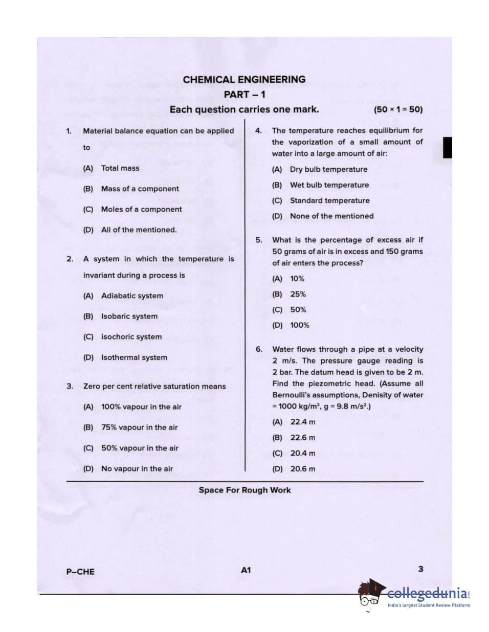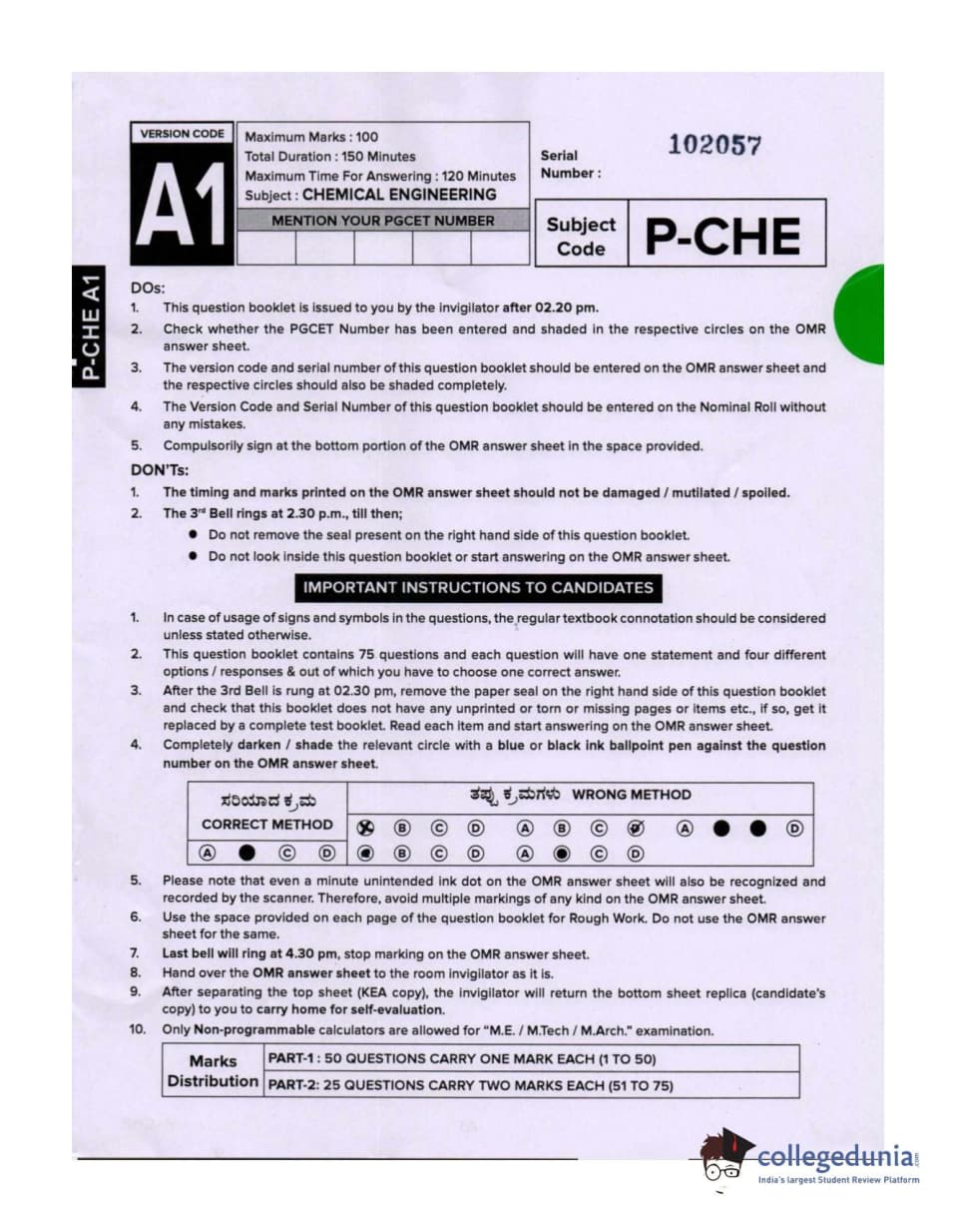 Karnataka PGCET 2020 Chemical Engineering Question paper with answer key pdf conducted on October 13, 2020 in Afternoon Session 2:30 PM to 4:30 PM for A-1 is available for download. The exam was successfully organized by Karnataka Examinations Authority (KEA). The question paper comprised a total of 75 questions.