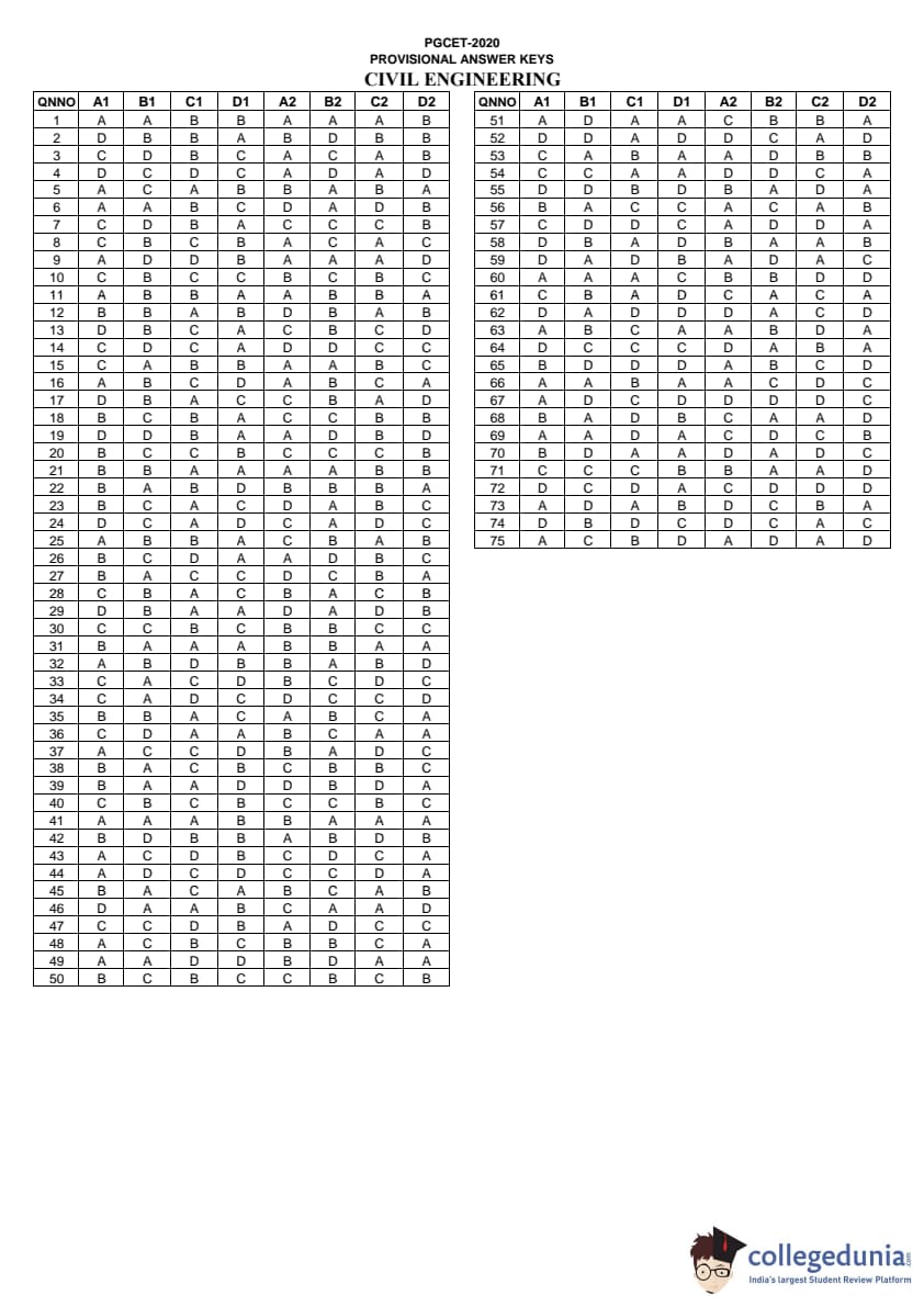 | Karnataka PGCET 2020 Civil Engineering Question Paper PDF | Karnataka PGCET 2020 Civil Engineering Answer Key PDF |
