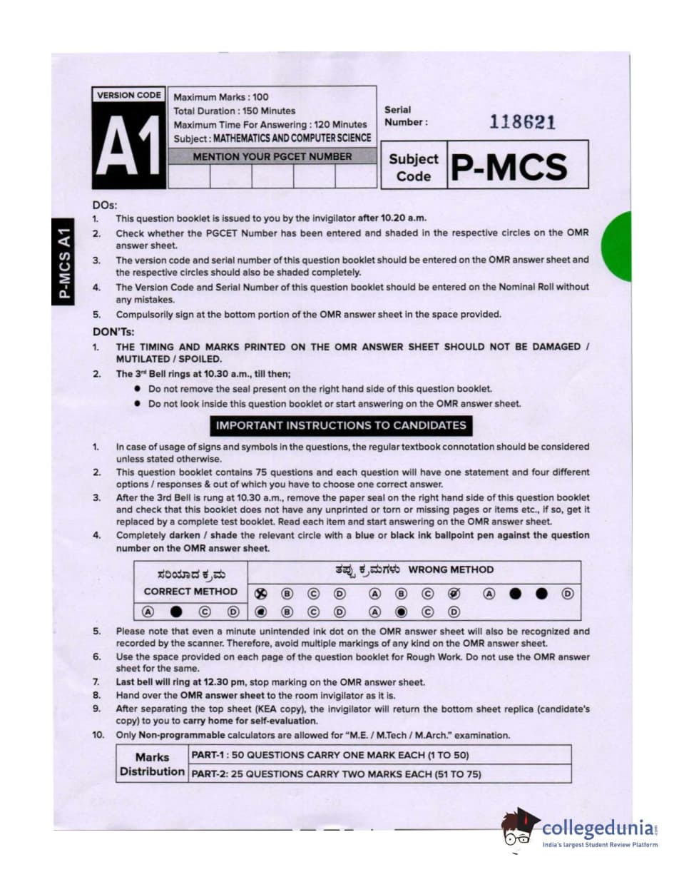 Karnataka PGCET 2020 Mathematics and Computer Science Question paper with answer key pdf conducted on October 13, 2020 in Morning Session 10:30 AM to 12:30 PM for A-1 is available for download. The exam was successfully organized by Karnataka Examinations Authority (KEA). The question paper comprised a total of 75 questions.