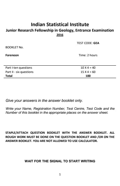 ISI Admission Test 2016 Junior Research Fellowship in Geology Question paper with answer key pdf conducted on May 8, 2016 is available for download. The exam was successfully organized by Indian Statistical Institute (ISI). The question paper comprised a total of 25 questions.