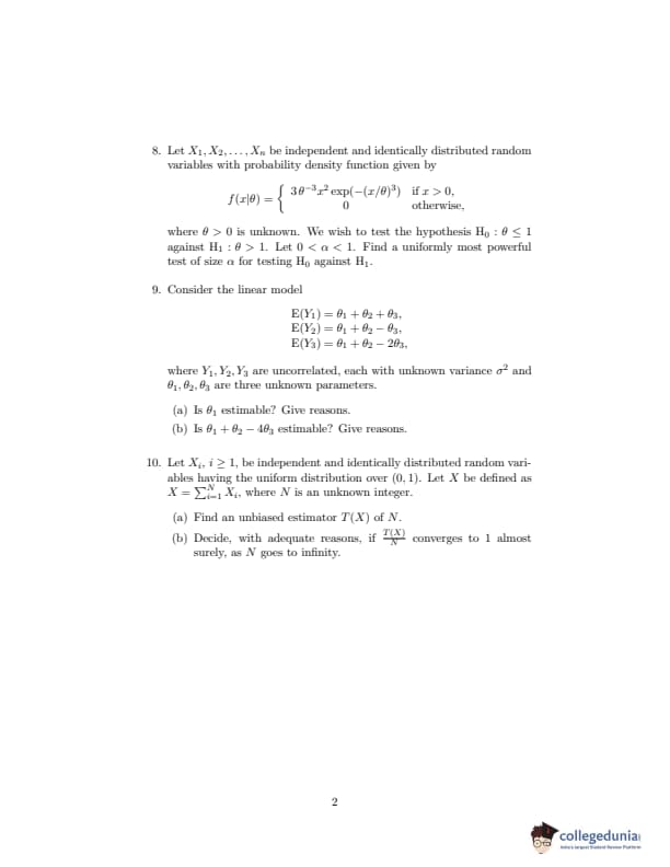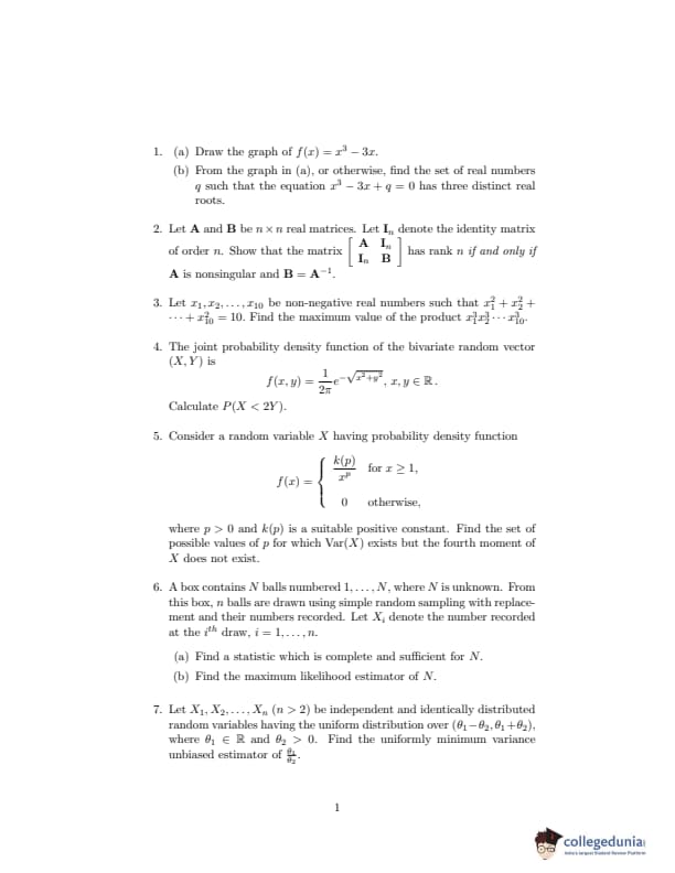 ISI Admission Test 2018 Junior Research Fellowship in Statistics Question paper with answer key pdf conducted on May 13, 2018 is available for download. The exam was successfully organized by Indian Statistical Institute (ISI). The question paper comprised a total of 10 questions.