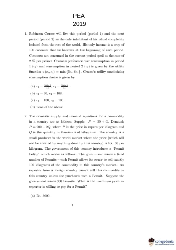 ISI Admission Test 2019 Master of Science in Quantitative Economics Question Paper with Answer Key PDFs