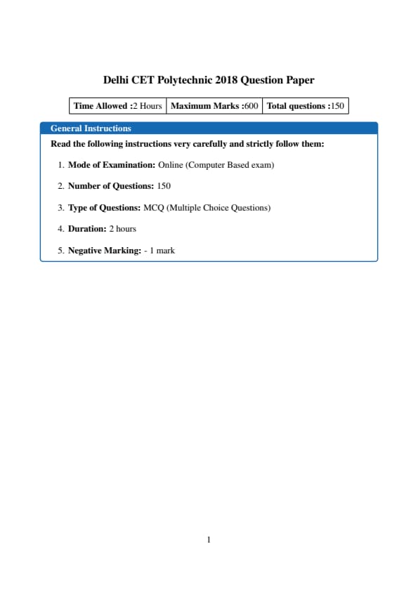 The Delhi Common Entrance Test (Delhi CET) 2018, organized by the Department of Training and Technical Education (DTTE), Government of NCT of Delhi, included Test 1, which was specifically designed for candidates seeking admission into full-time diploma programs in Engineering, Technology, and Occupational courses offered by various polytechnic institutions across Delhi.
