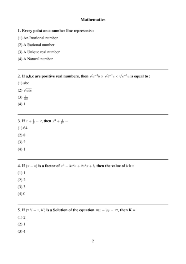 Both methods yield the same result. Quick Tip: A useful trick: If \(x + \frac{1}{x} = 2\), then \(x\) must be 1. You can check this: \(1 + \frac{1}{1} = 1 + 1 = 2\). Once you know \(x=1\), then \(x^n + \frac{1}{x^n}\) will always be \(1^n + \frac{1}{1^n} = 1+1 = 2\) for any integer \(n\). So, \(x^3 + \frac{1}{x^3} = 2\).