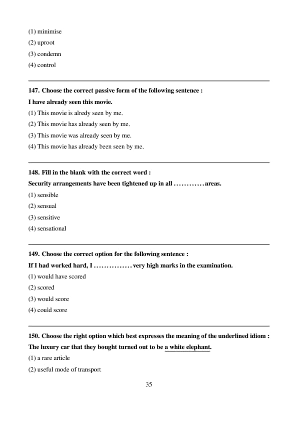 (4) This movie has already been seen by me. (Correct present perfect passive form.) Quick Tip: Active (Present Perfect): Subject + has/have + V3 + Object. Passive (Present Perfect): Object (as new Subject) + has/have + been + V3 + by + Agent. Active: I have seen this movie. Passive: This movie has been seen by me. The adverb "already" fits in nicely: "This movie has already been seen by me."