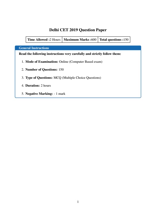 The Delhi CET 2019 Test 1 was conducted in offline mode and consisted of 150 multiple-choice questions from Mathematics (50 questions), Physics (40), Chemistry (30), Biology (15), and English (15), with a total duration of 2 hours and 30 minutes; each correct answer awarded 4 marks, while 1 mark was deducted for every incorrect response.