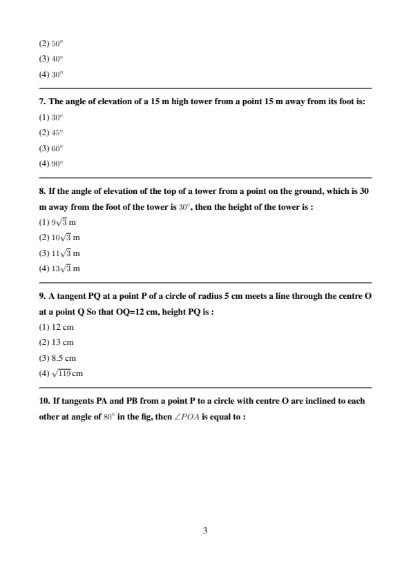 If the angle of elevation of the top of a tower from a point on the ground, which is 30 m away from the foot of the tower is \(30^\circ\), then the height of the tower is :