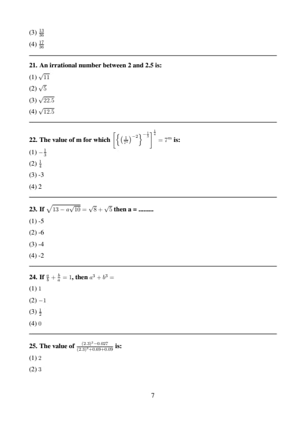 The value of m for which \(\left[\left\{\left(\frac{1}{7^2}\right)^{-2}\right\}^{-\frac{1}{3}}\right]^{\frac{1}{4}} = 7^m\) is: