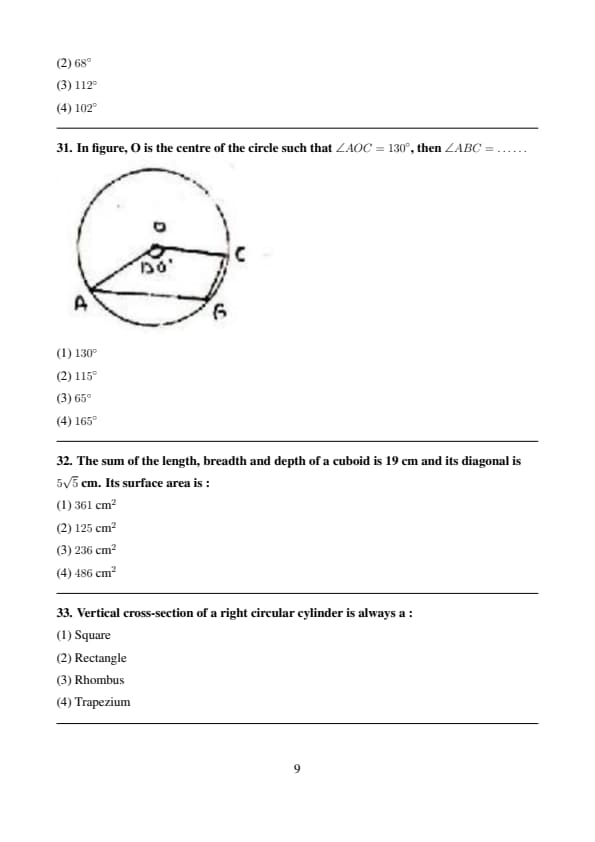 In figure, O is the centre of the circle such that \(\angle AOC=130^\circ\), then \(\angle ABC=\dots\dots\)