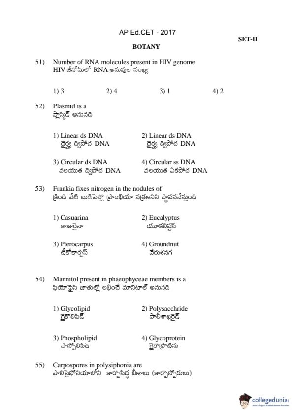 AP EDCET 2017 Botany Question paper with answer key pdf conducted on April 19, 2017 is available for download. The exam was successfully organized by Andhra University. The question paper comprised a total of 50 questions.