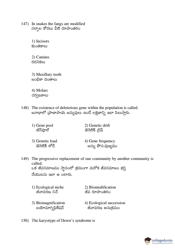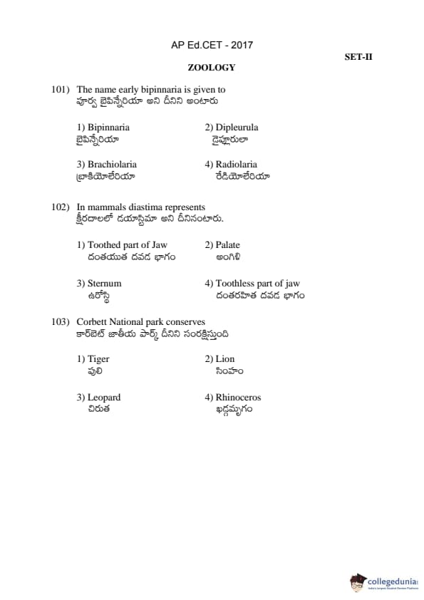AP EDCET 2017 Zoology Question paper with answer key pdf conducted on April 19, 2017 is available for download. The exam was successfully organized by Andhra University. The question paper comprised a total of 50 questions.