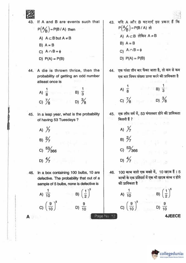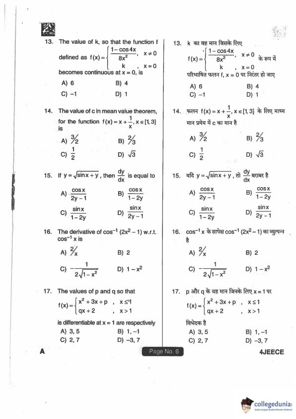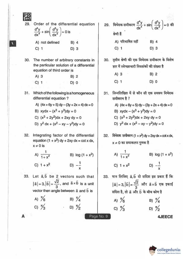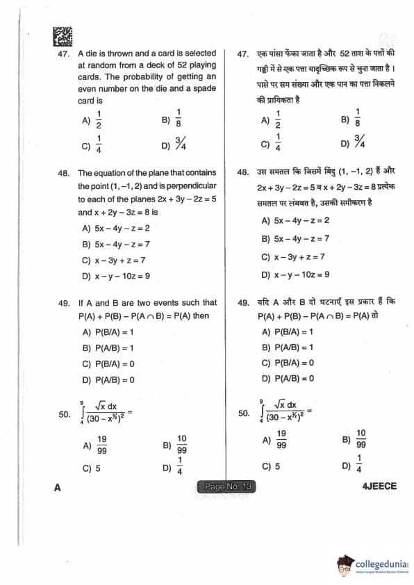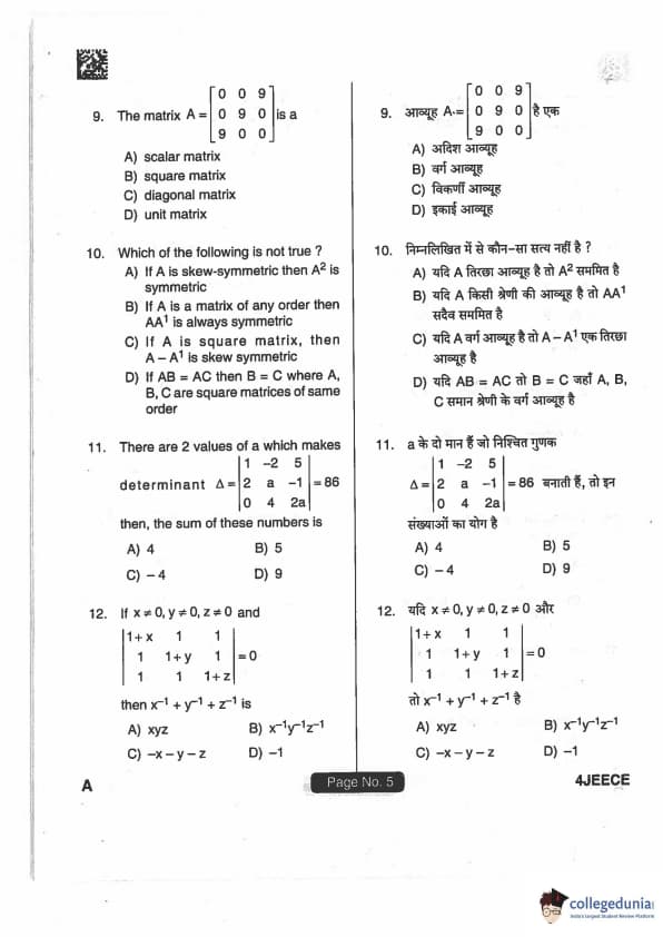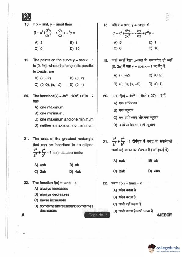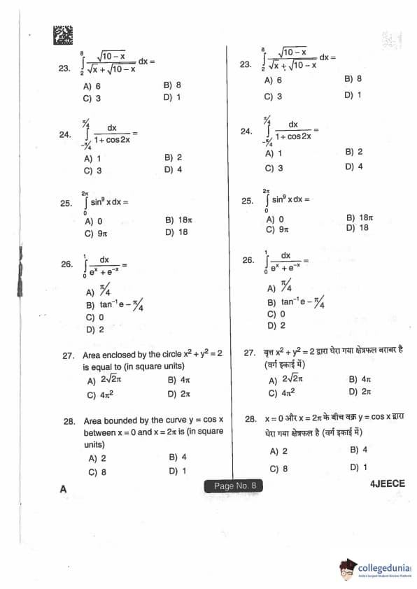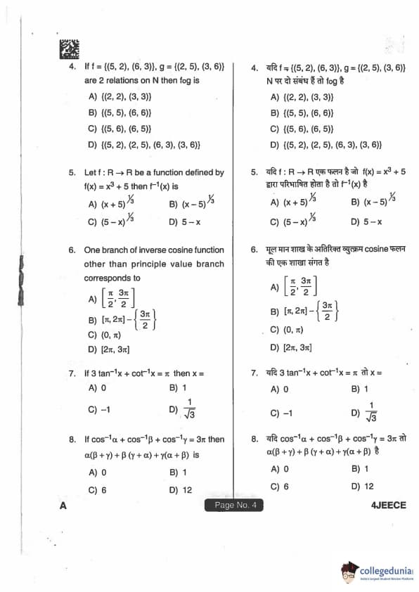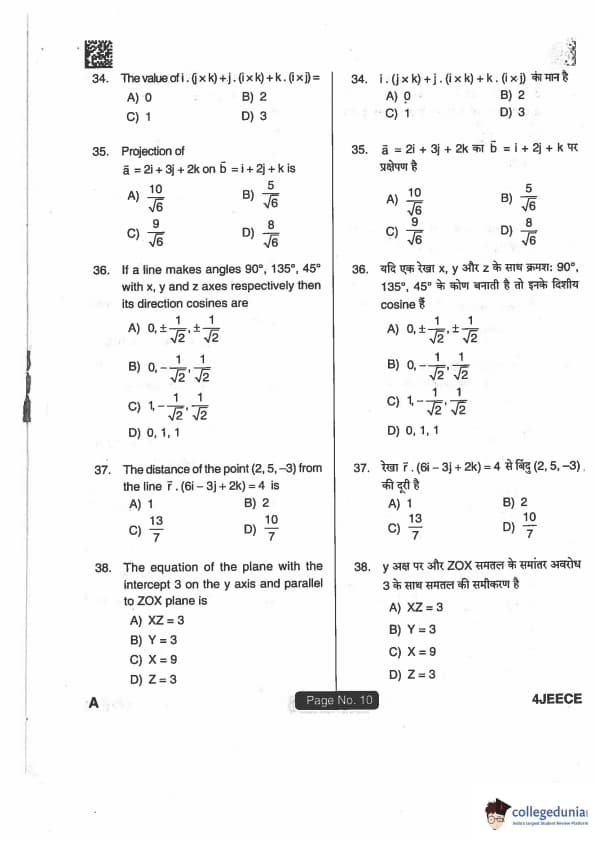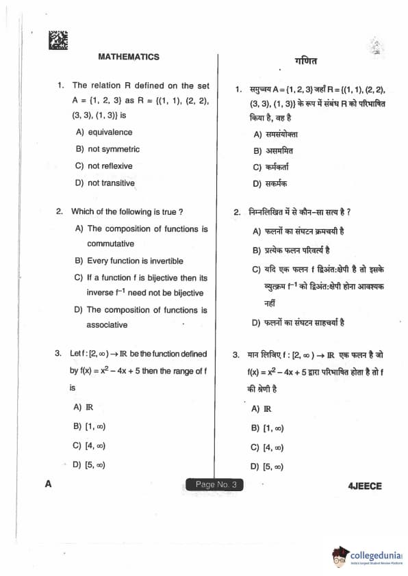 JEECE 2018 Mathematics Code A Question paper with answer key pdf conducted on May 26, 2018 is available for download. The exam was successfully organized by Jharkhand Combined Entrance Competitive Examination Board (JCECEB). The question paper comprised a total of 50 questions.
