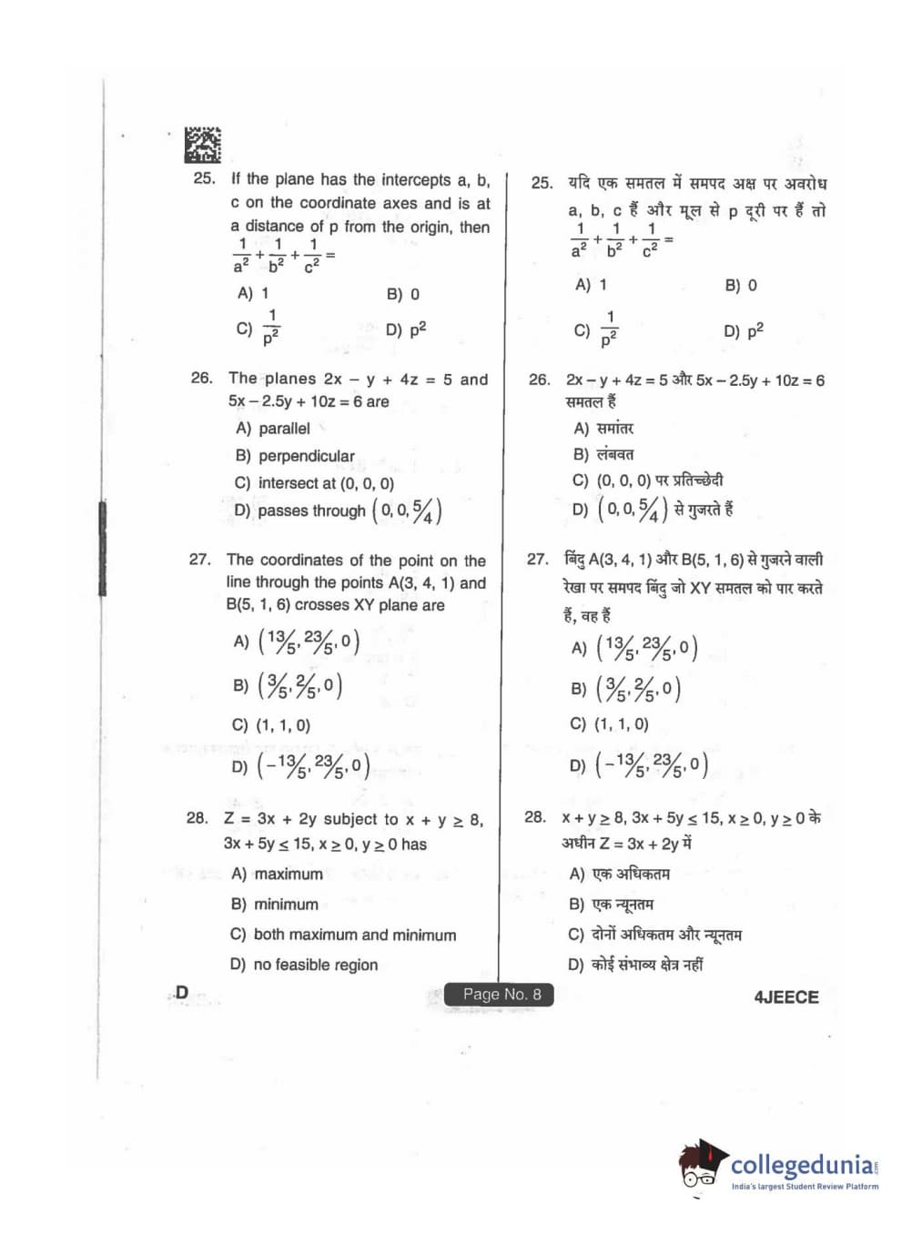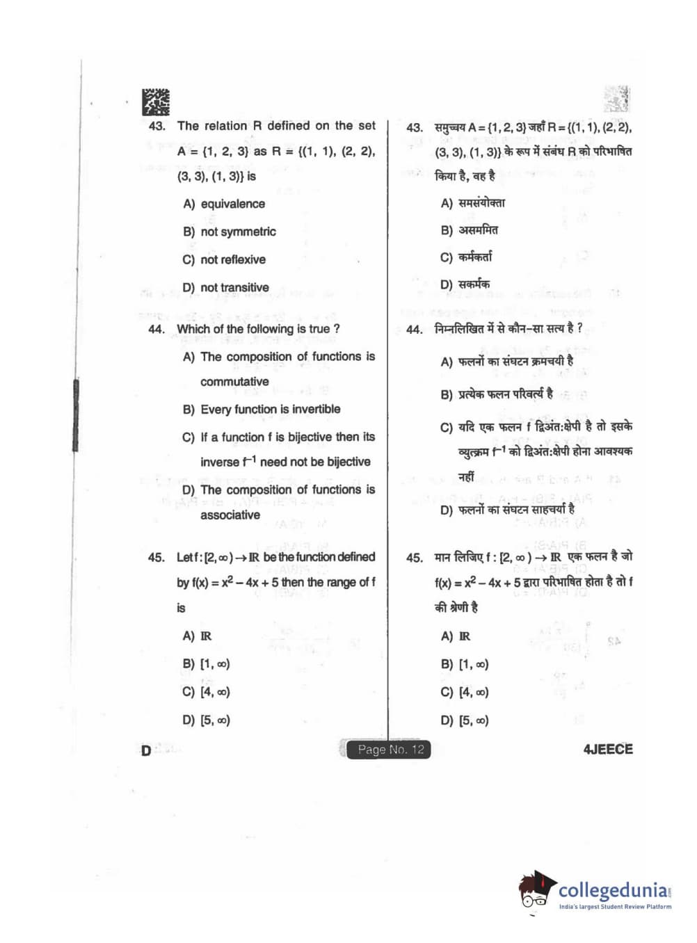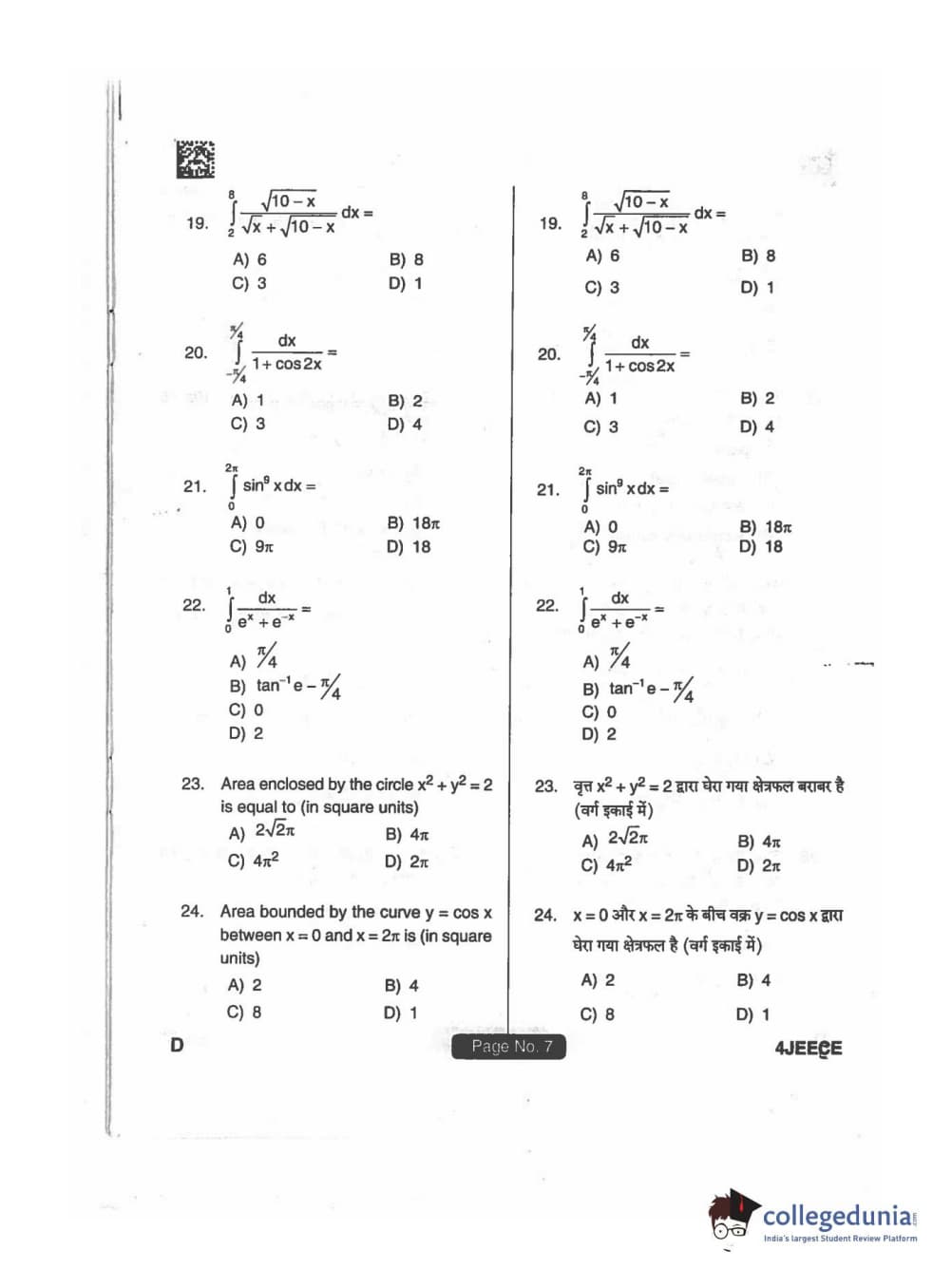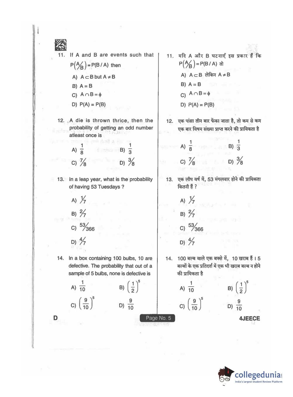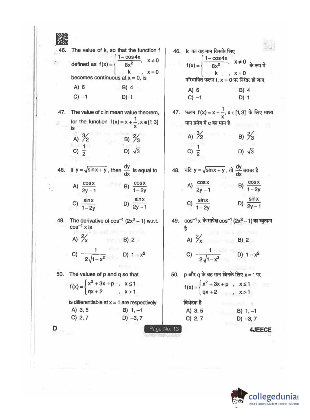 JEECE 2018 Mathematics Code D Question Paper with Answer Key PDFs