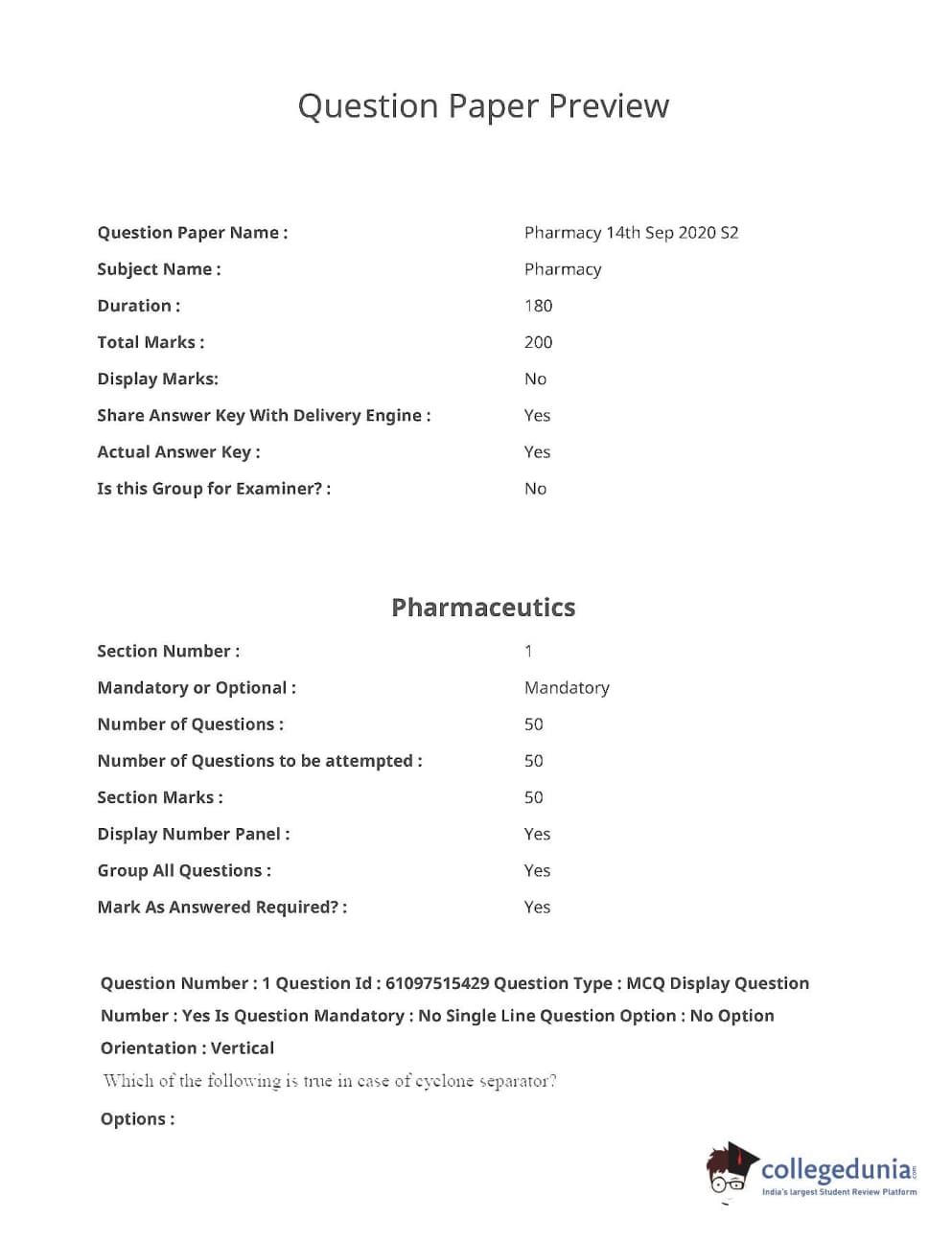 AP ECET 2020 Pharmacy Question paper with answer key pdf conducted on September 14, 2020 in Shift 2 is available for download. The exam was successfully organized by Jawaharlal Nehru Technology (JNT) University, Anantapur. The question paper comprised a total of 200.0 questions.