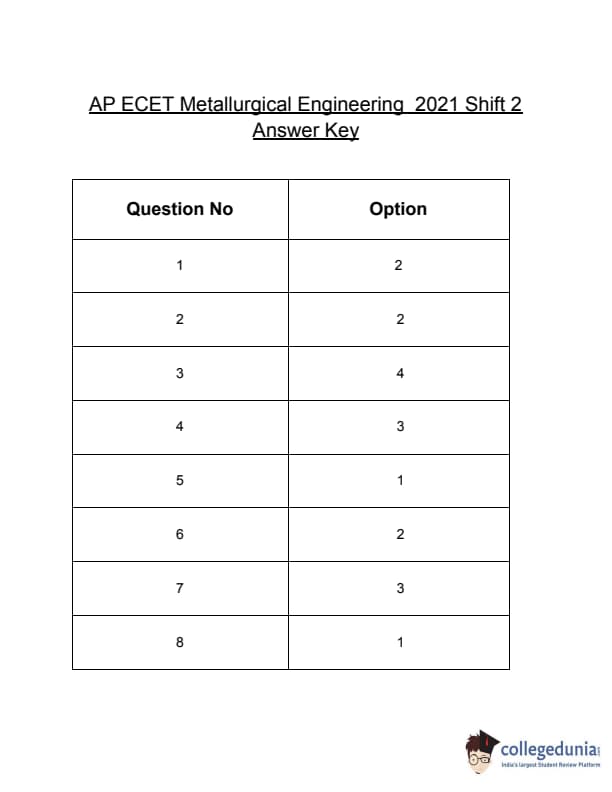 | AP ECET 2021 Metallurgical Engineering Question Paper PDF | AP ECET 2021 Metallurgical Engineering Answer Key PDF |