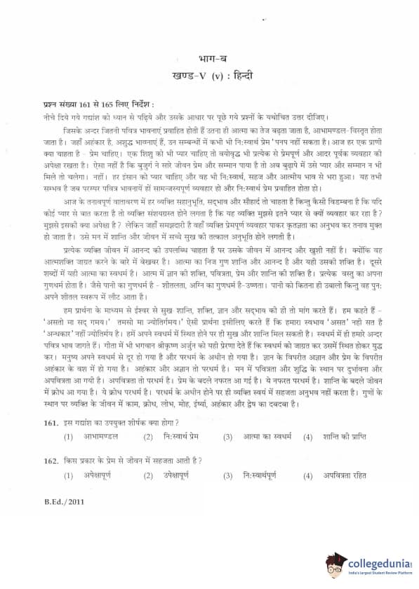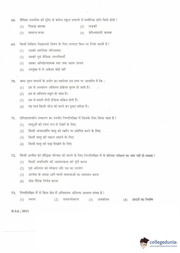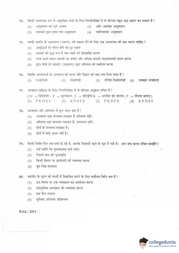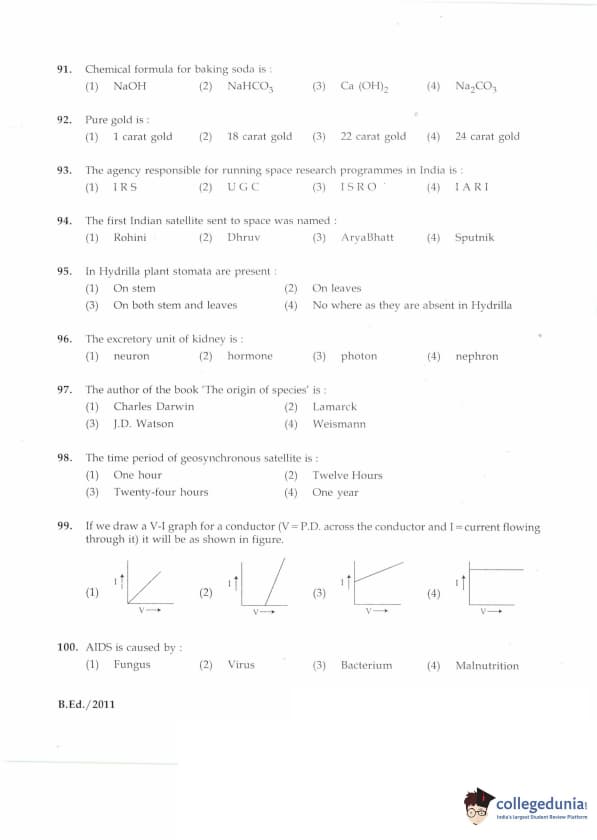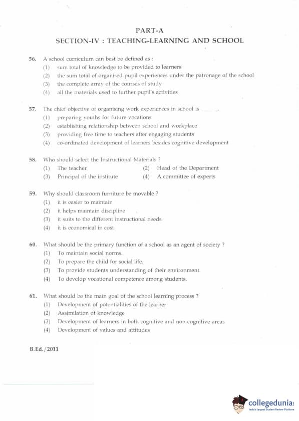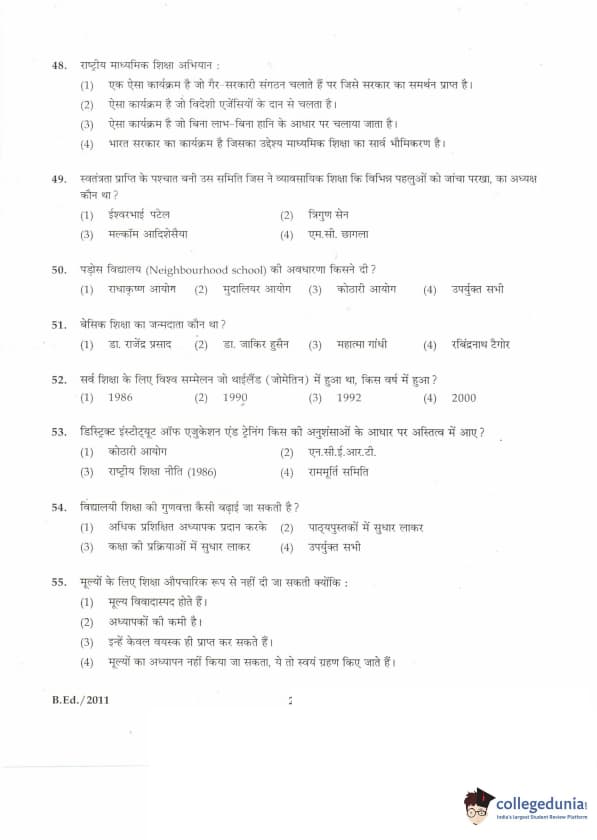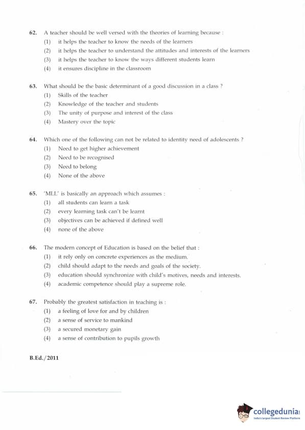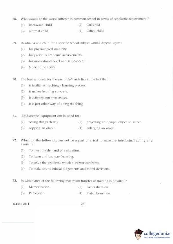 IGNOU B.Ed. Entrance Exam 2011 Question paper with answer key pdf is available for download. The exam was successfully organized by Indira Gandhi National Open University (IGNOU). The question paper comprised a total of 100 questions divided into 5 sections.