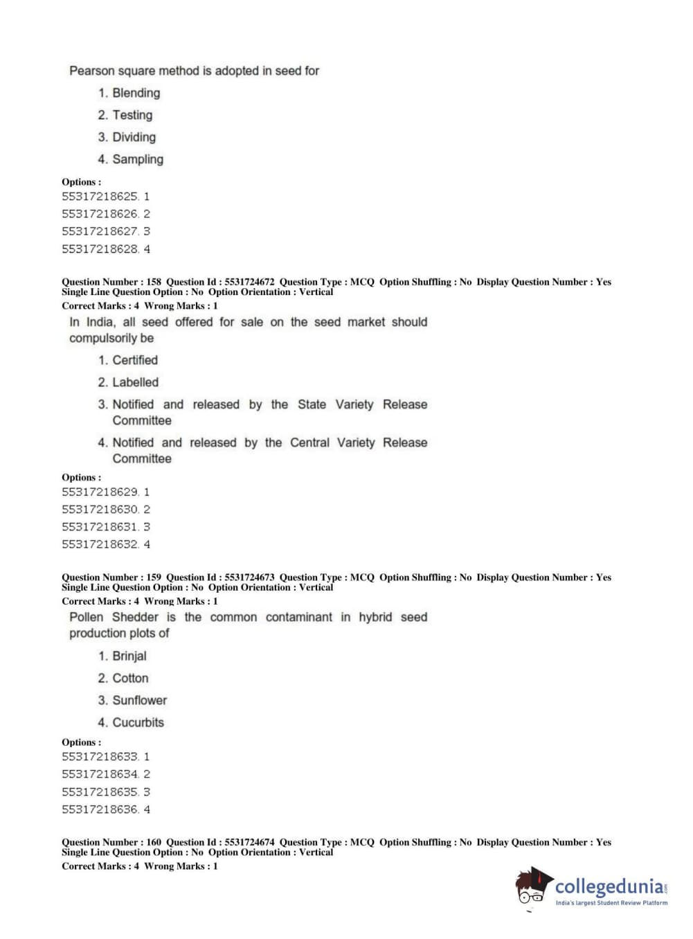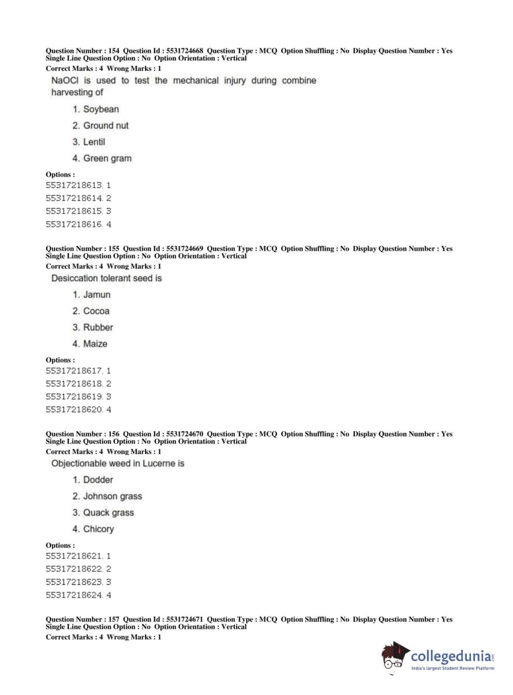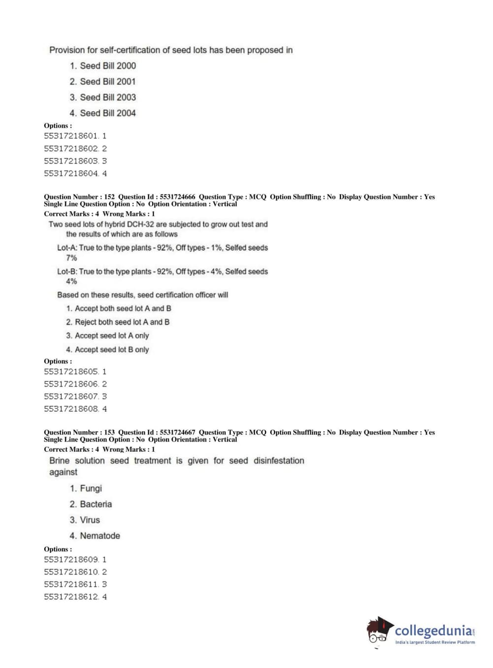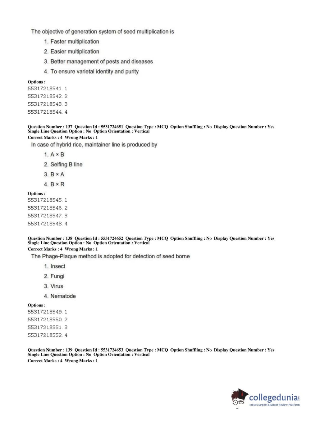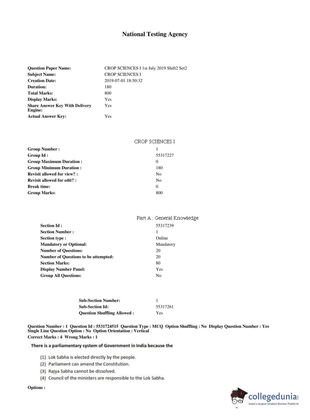 ICAR AIEEA 2019 JRF - CROP SCIENCES I Question paper with answer key pdf conducted on July 1, 2019 in Afternoon Session is available for download. The exam was successfully organized by National Testing Agency (NTA). The question paper comprised a total of 200 questions.