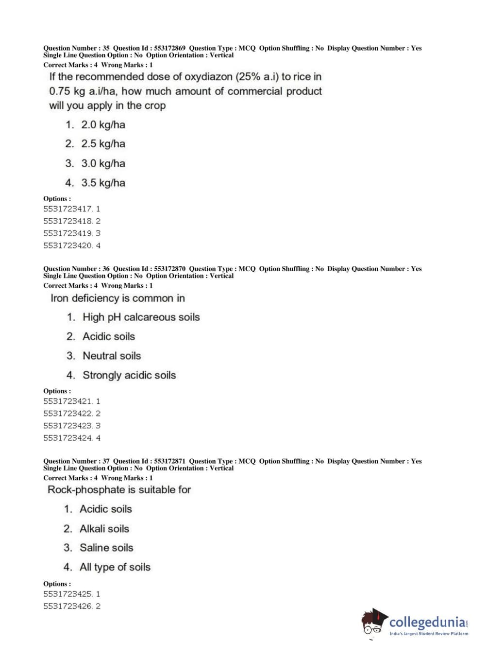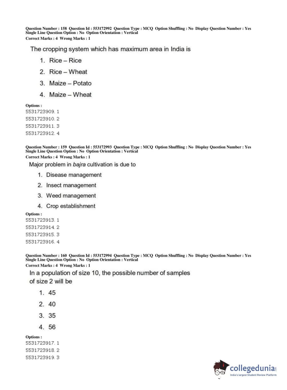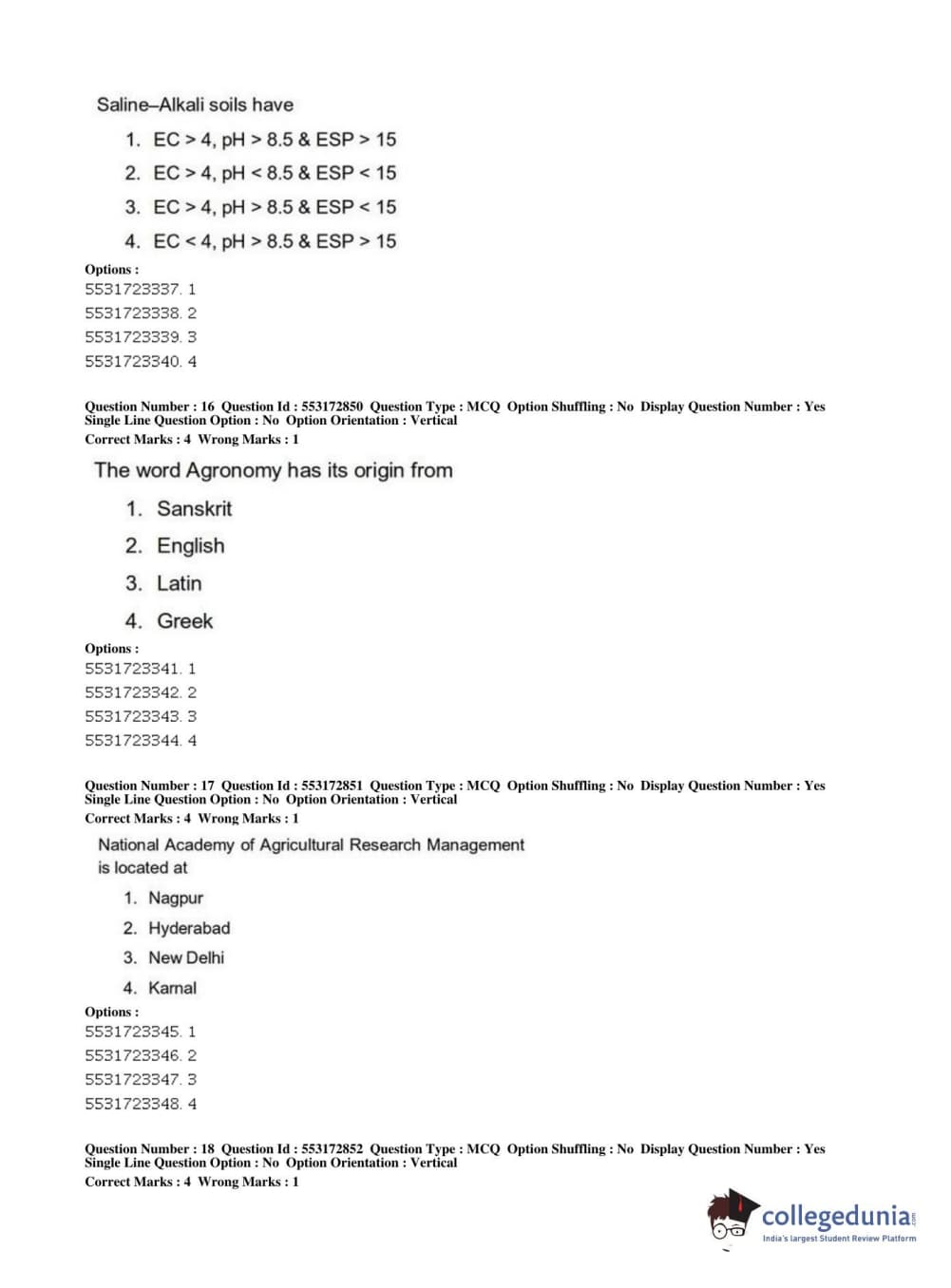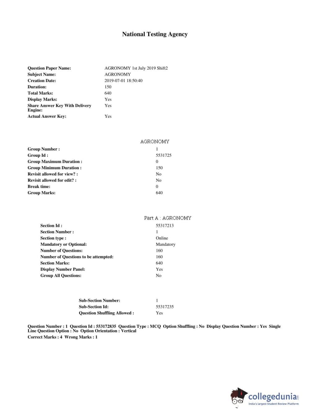 ICAR AIEEA 2019 PG - AGRONOMY Question paper with answer key pdf conducted on July 1, 2019 in Shift 2 is available for download. The exam was successfully organized by National Testing Agency (NTA). The question paper comprised a total of 160 questions.