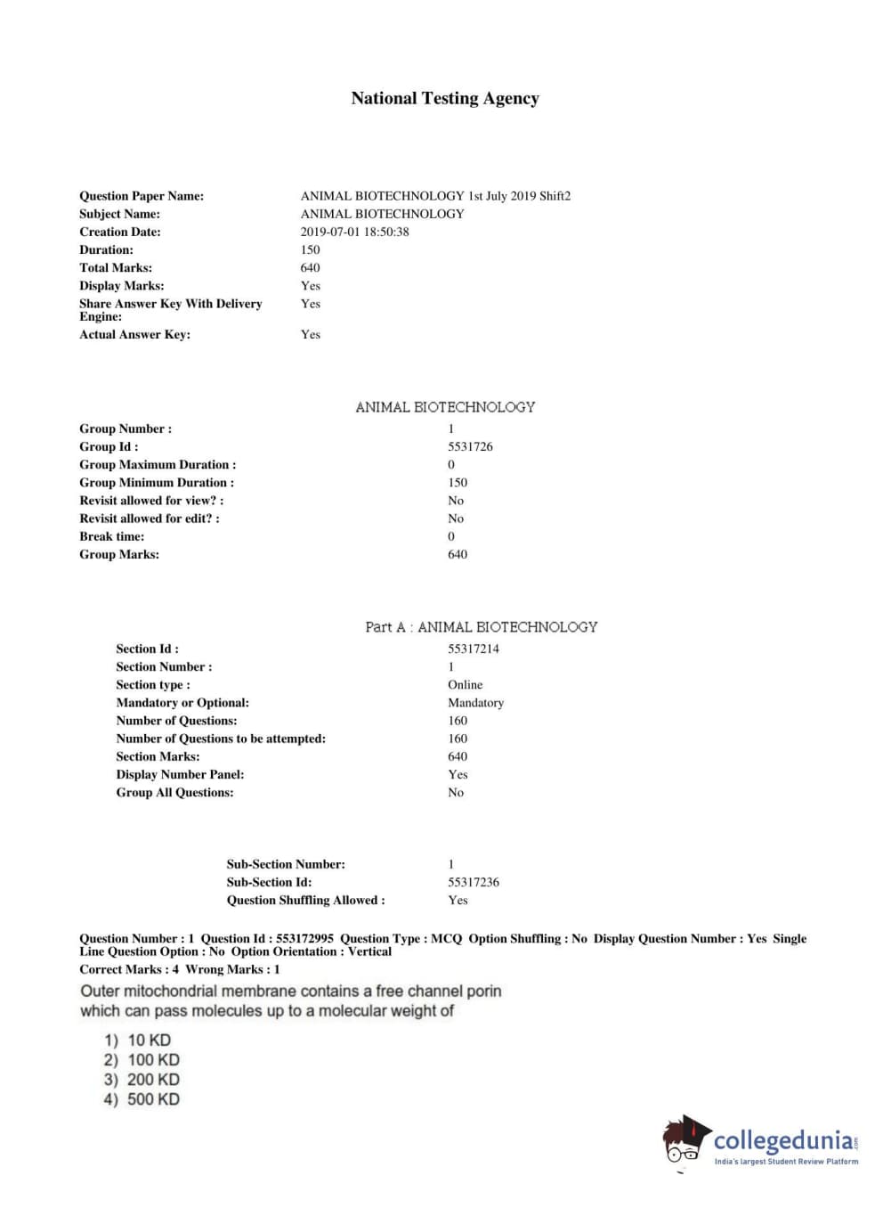 ICAR AIEEA 2019 PG - ANIMAL BIOTECHNOLOGY Question paper with answer key pdf conducted on July 1, 2019 in Shift 2 is available for download. The exam was successfully organized by National Testing Agency (NTA). The question paper comprised a total of 160 questions.