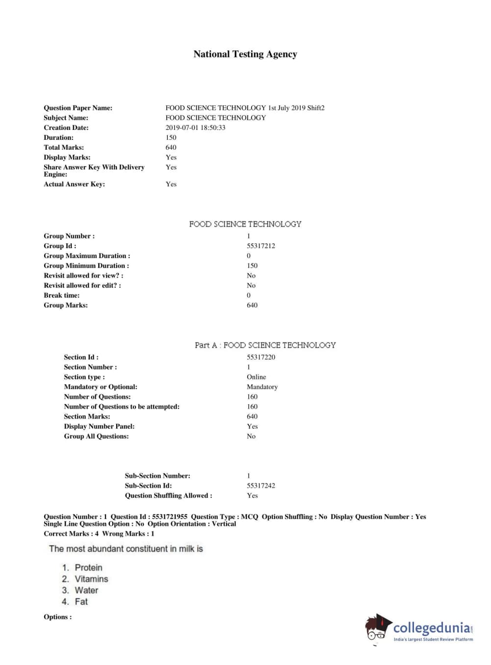 ICAR AIEEA 2019 PG - FOOD SCIENCE TECHNOLOGY Question paper with answer key pdf conducted on July 1, 2019 in Shift 2 is available for download. The exam was successfully organized by National Testing Agency (NTA). The question paper comprised a total of 160 questions.