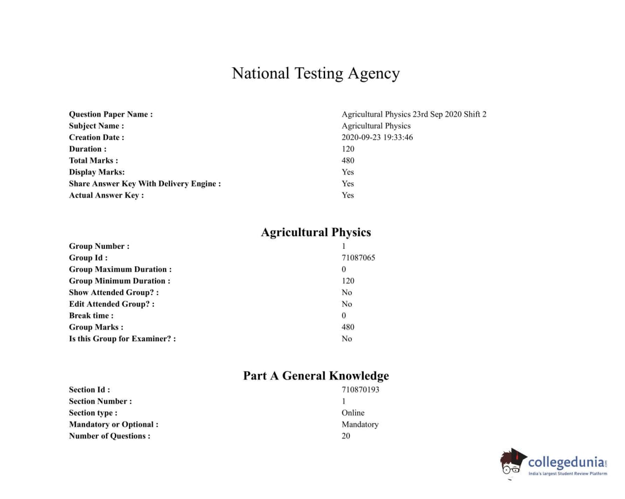 ICAR AIEEA 2020 JRF - AGRICULTURAL PHYSICS Question paper with answer key pdf conducted on September 23, 2020 in Afternoon Session is available for download. The exam was successfully organized by National Testing Agency (NTA). The question paper comprised a total of 120 questions.
