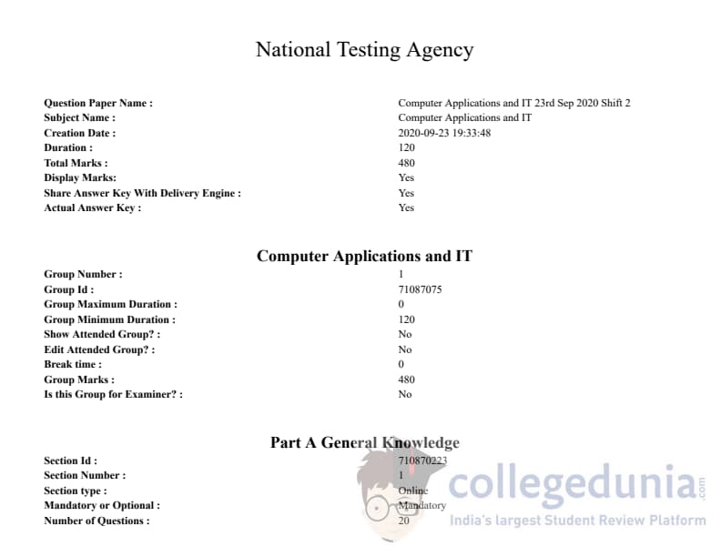ICAR AIEEA 2020 JRF - COMPUTER APPLICATIONS AND IT Question paper with answer key pdf conducted on September 23, 2020 in Afternoon Session is available for download. The exam was successfully organized by National Testing Agency (NTA). The question paper comprised a total of 120 questions.
