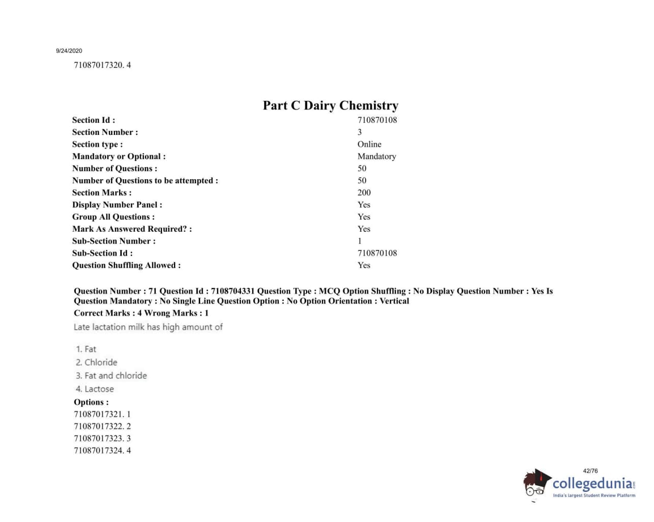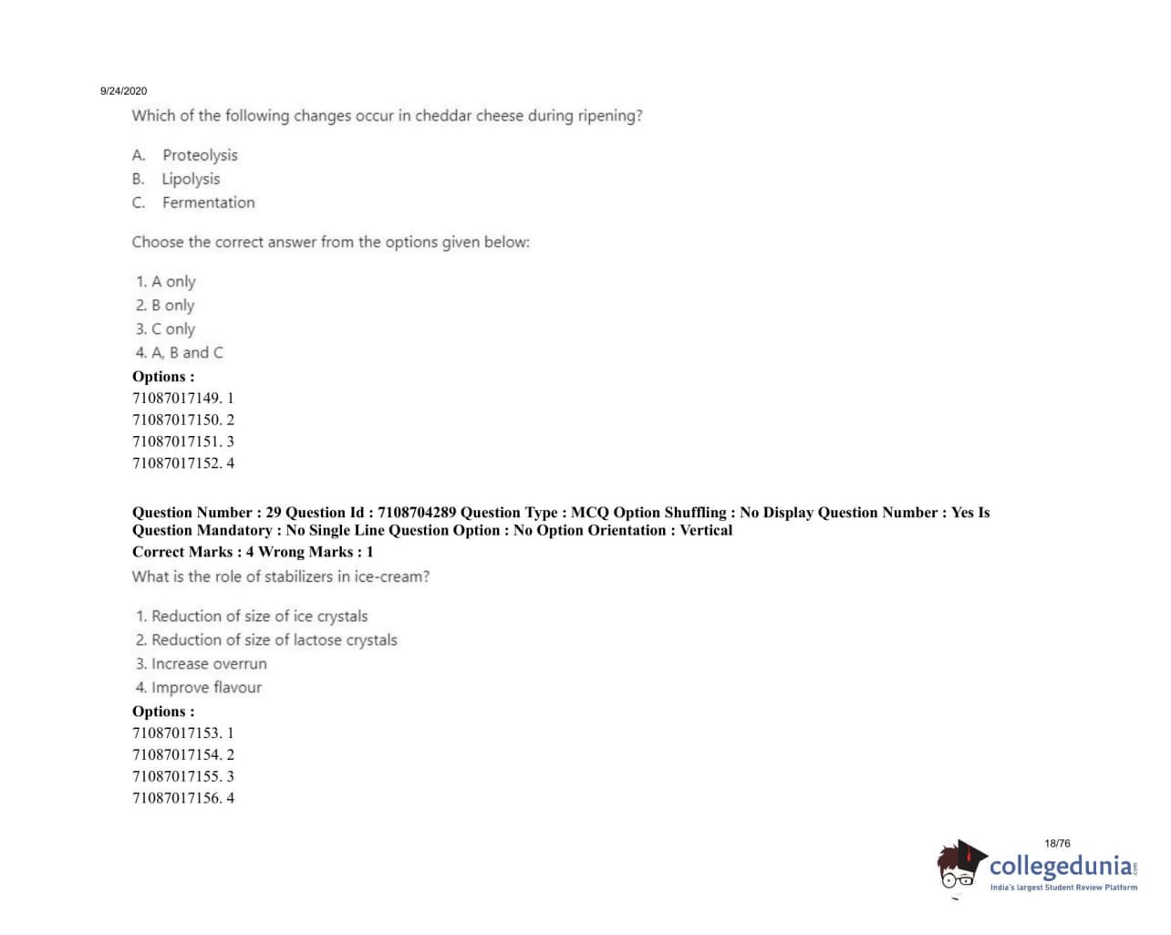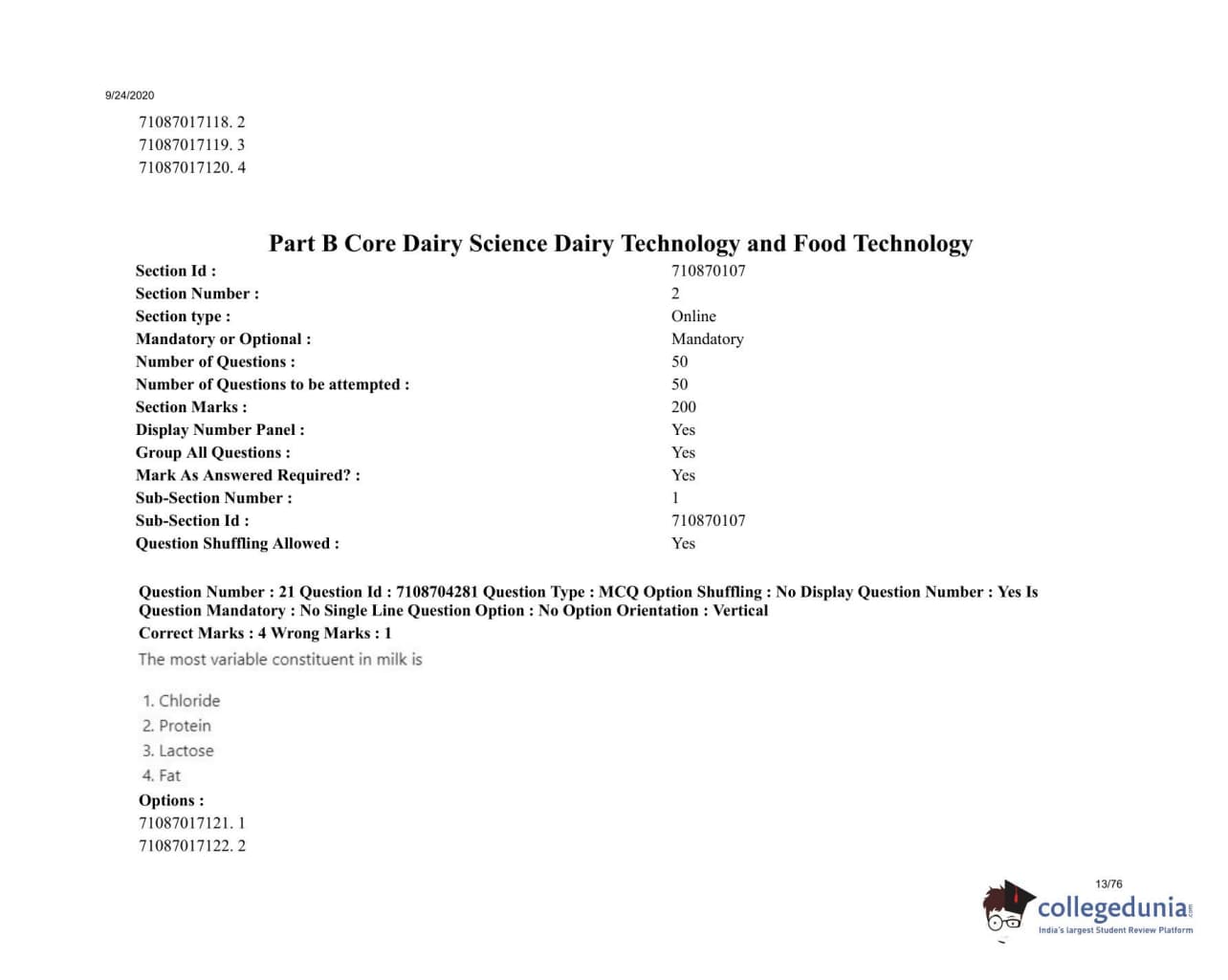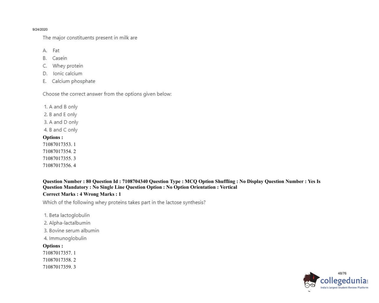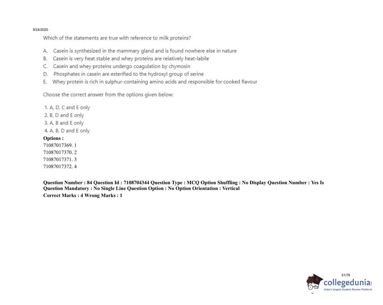 ICAR AIEEA 2020 JRF - DAIRY CHEMISTRY Question Paper with Answer Key PDFs Afternoon Session