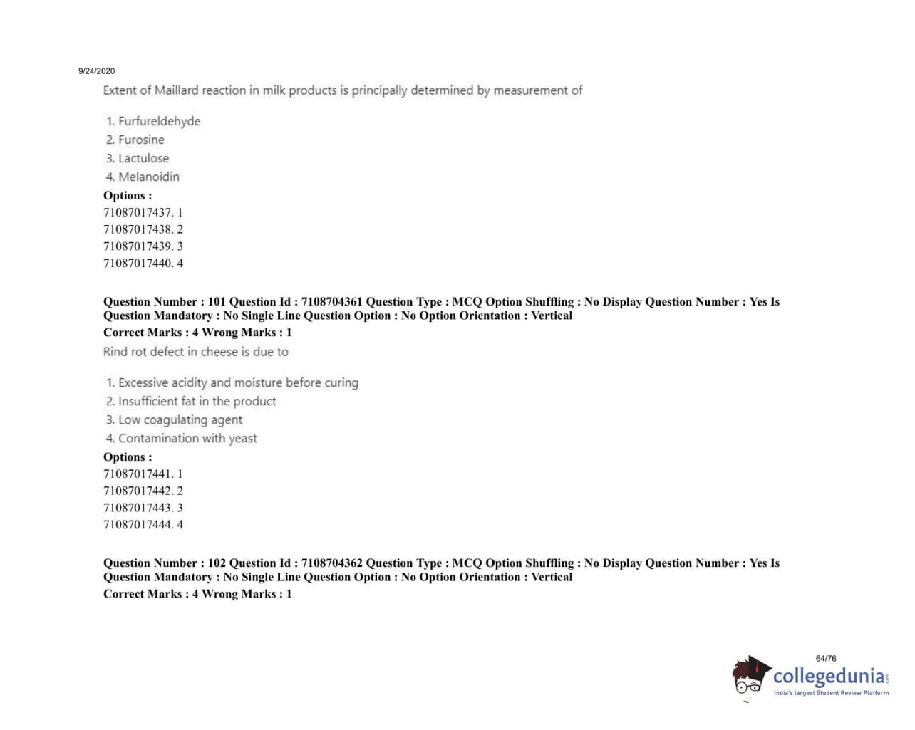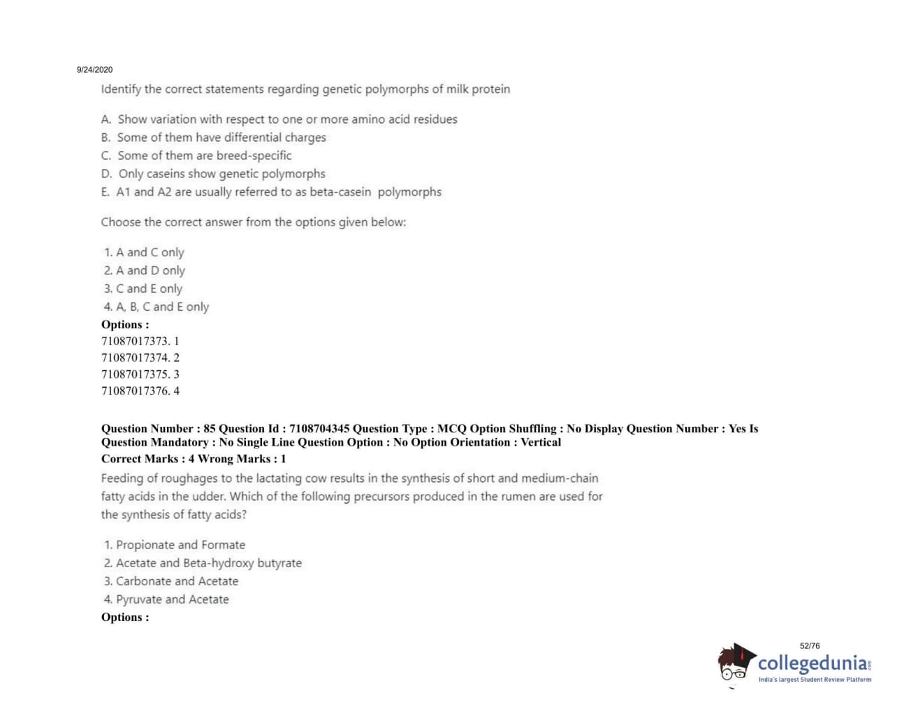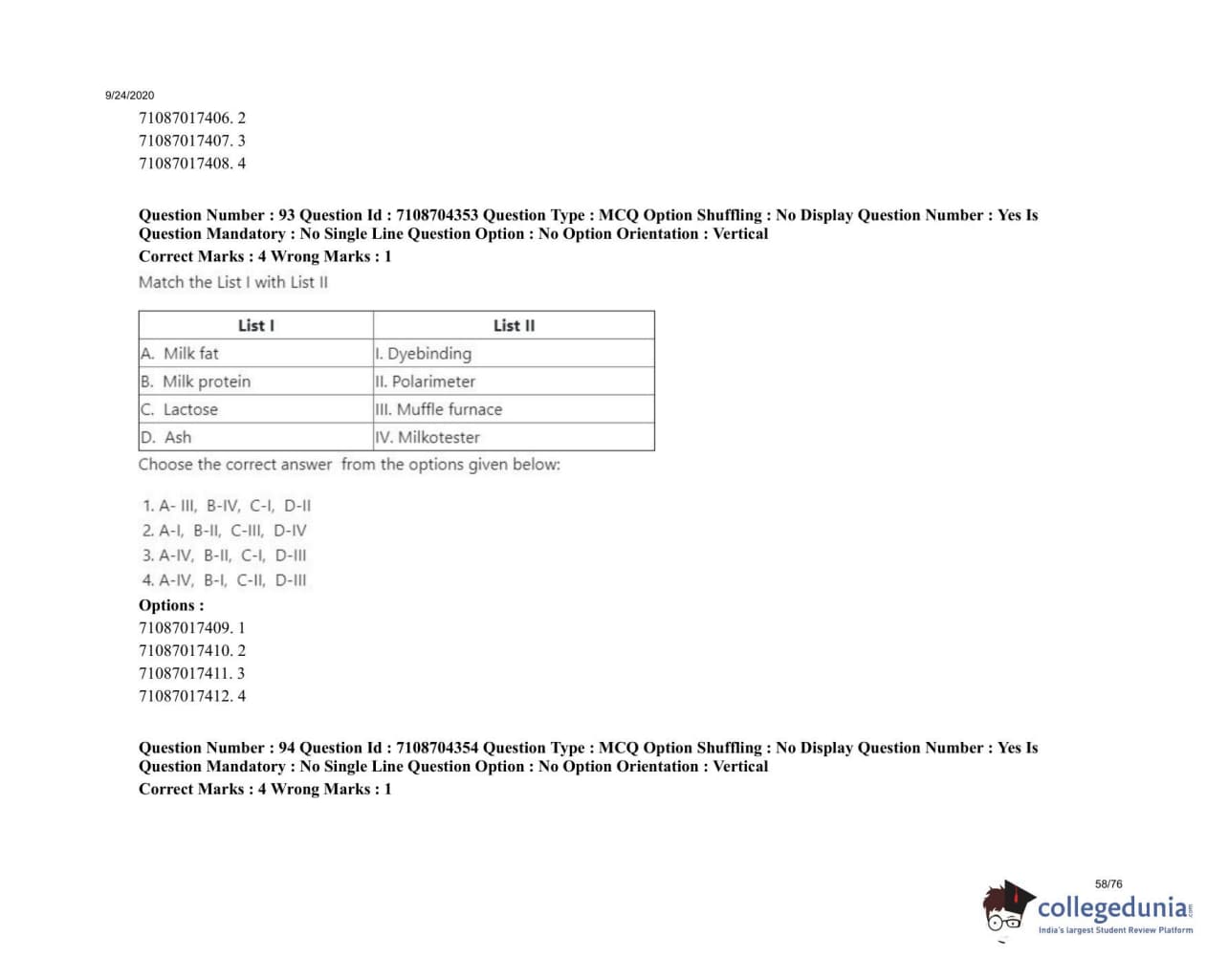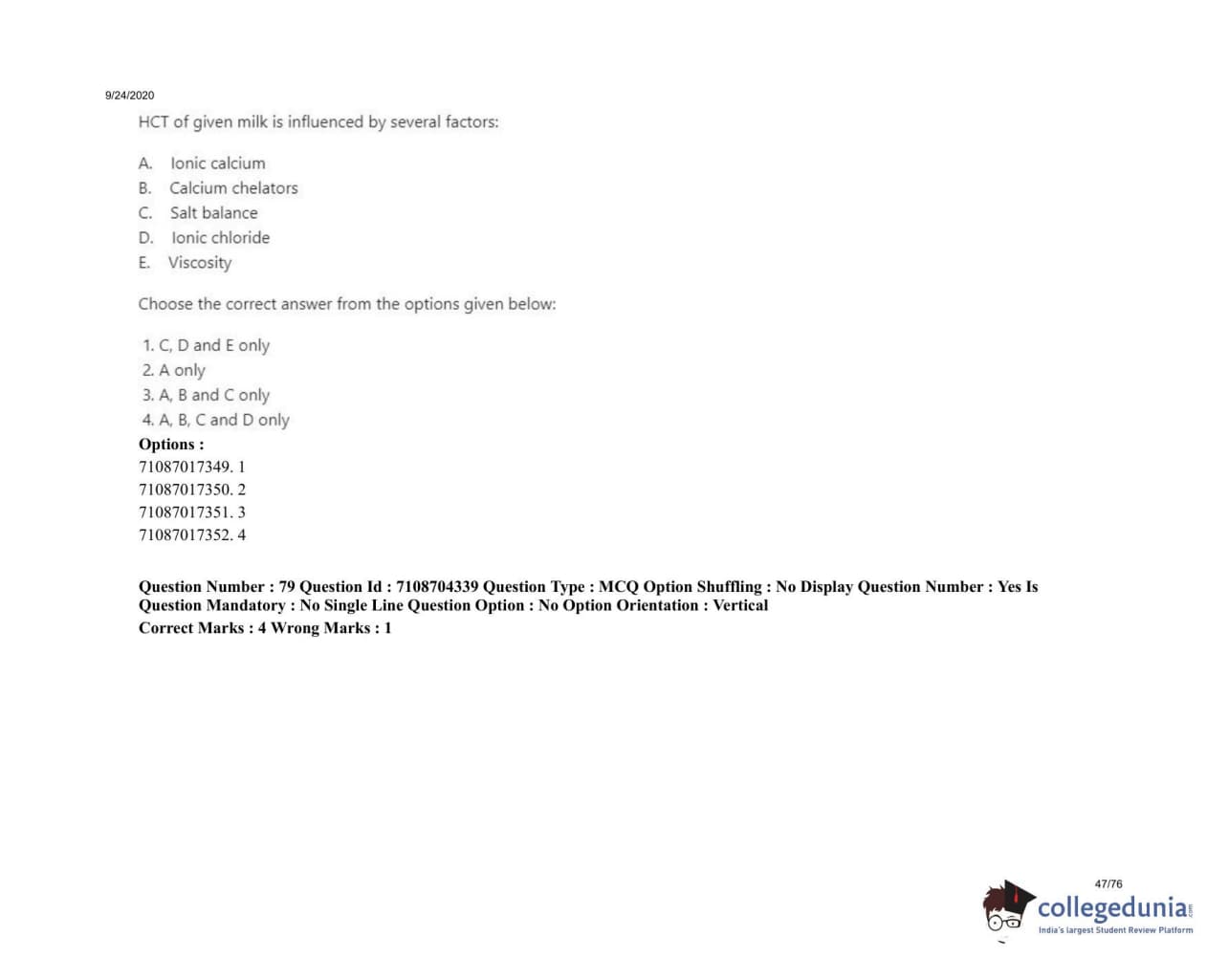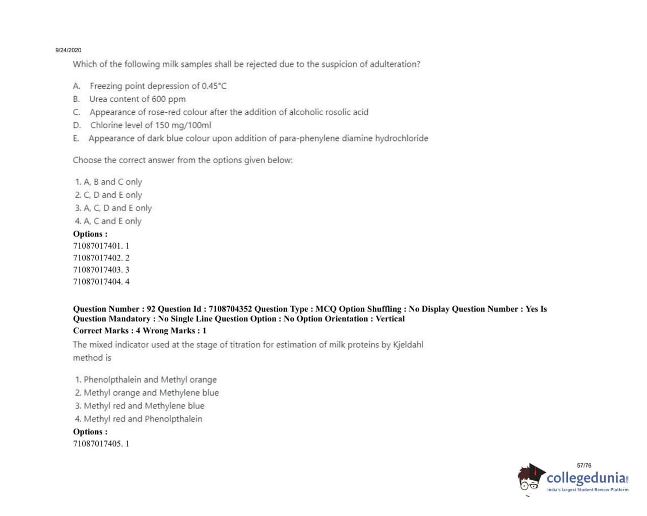 ICAR AIEEA 2020 JRF - DAIRY CHEMISTRY Question Paper with Answer Key PDFs Afternoon Session