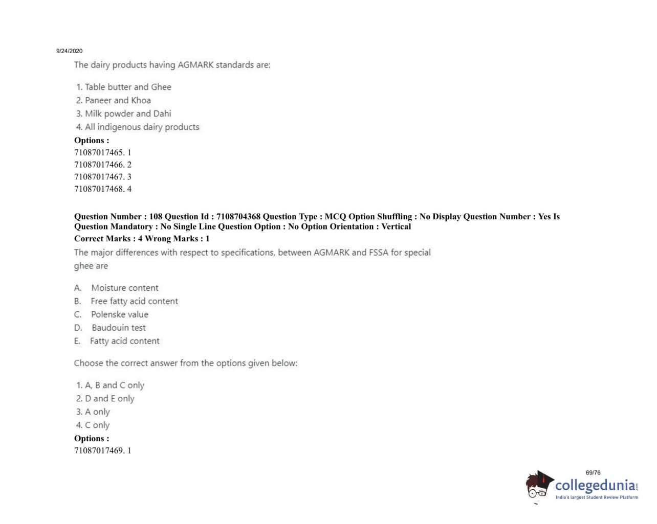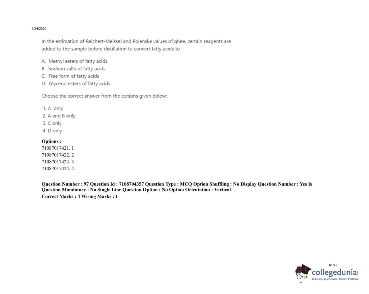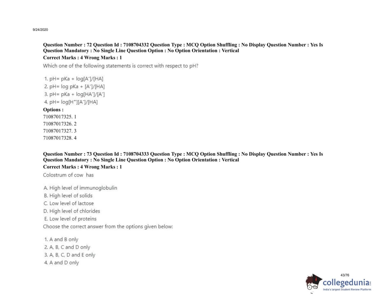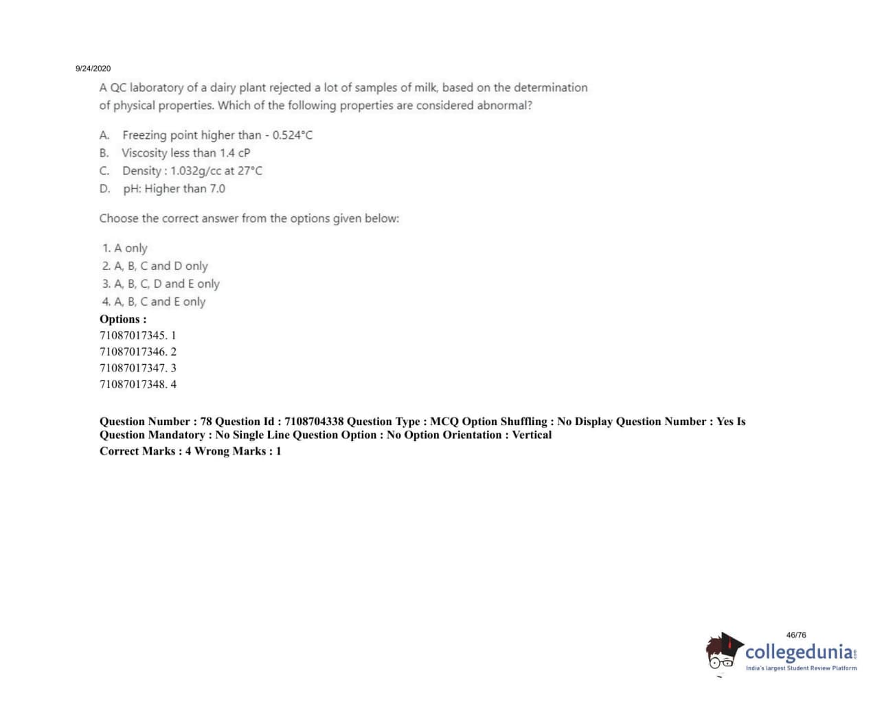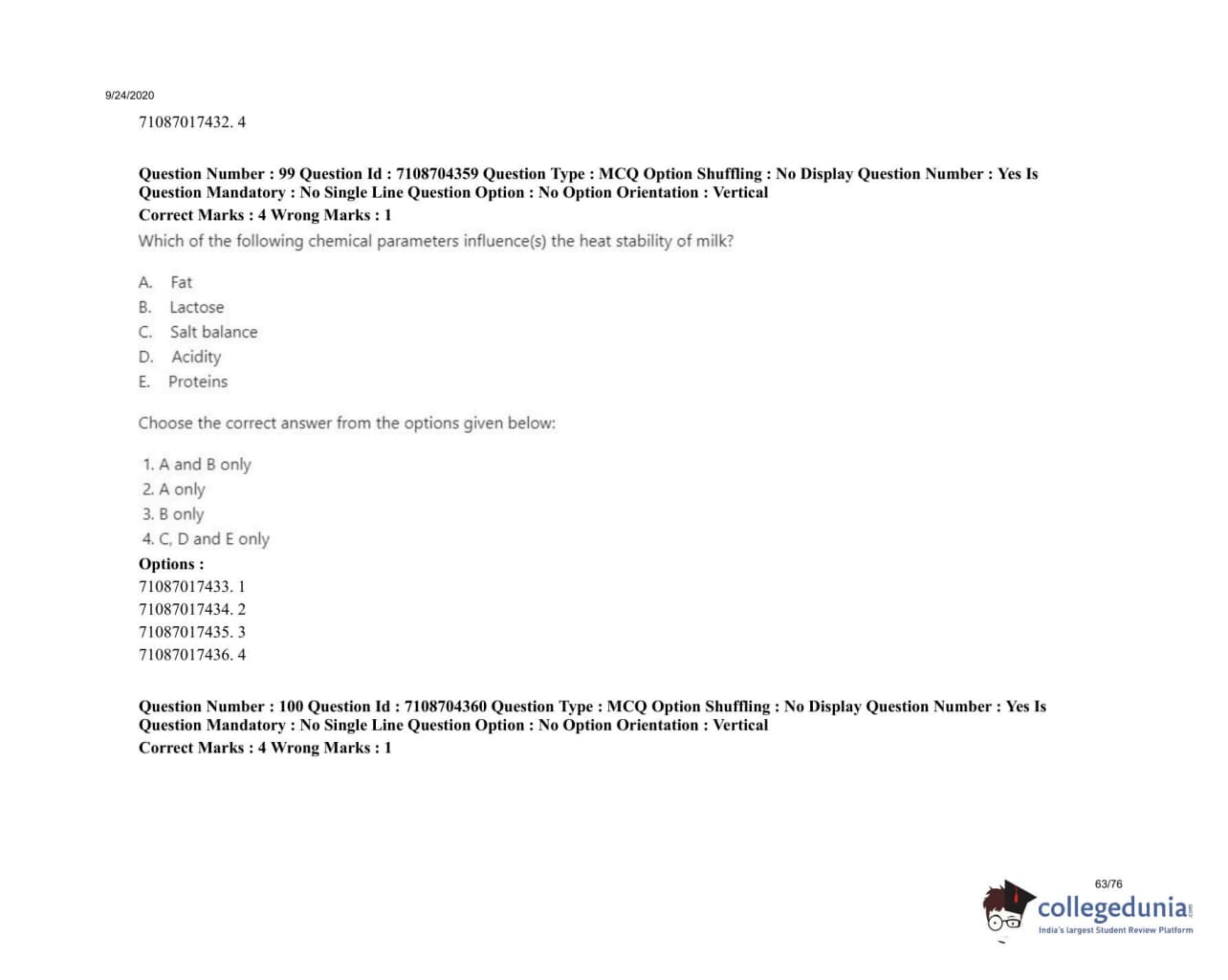 ICAR AIEEA 2020 JRF - DAIRY CHEMISTRY Question Paper with Answer Key PDFs Afternoon Session