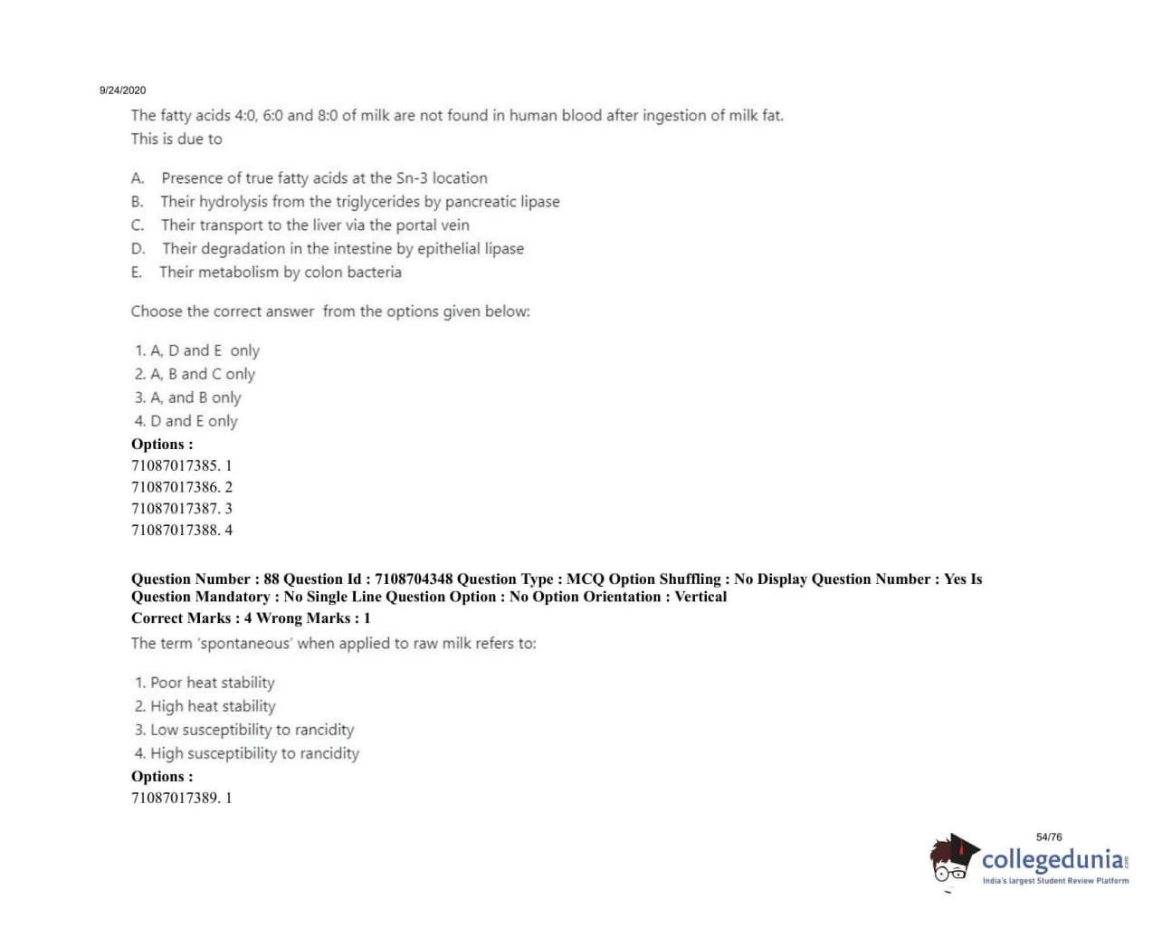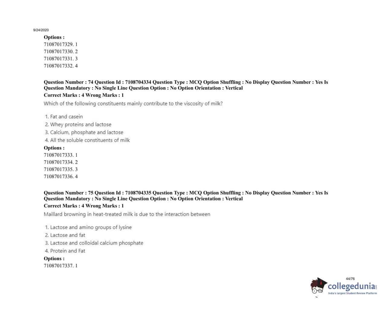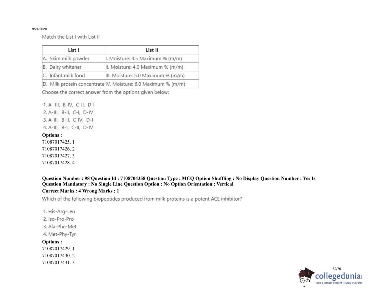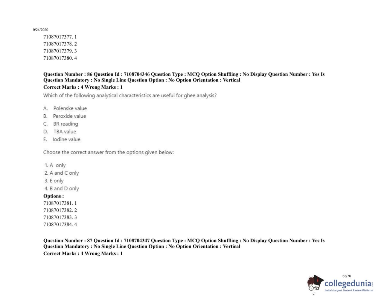 ICAR AIEEA 2020 JRF - DAIRY CHEMISTRY Question Paper with Answer Key PDFs Afternoon Session