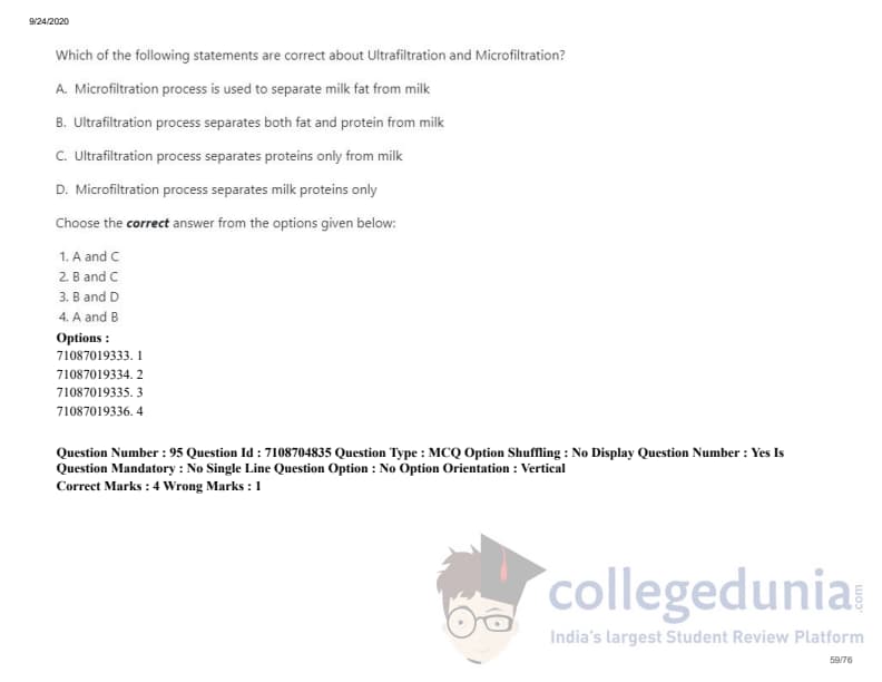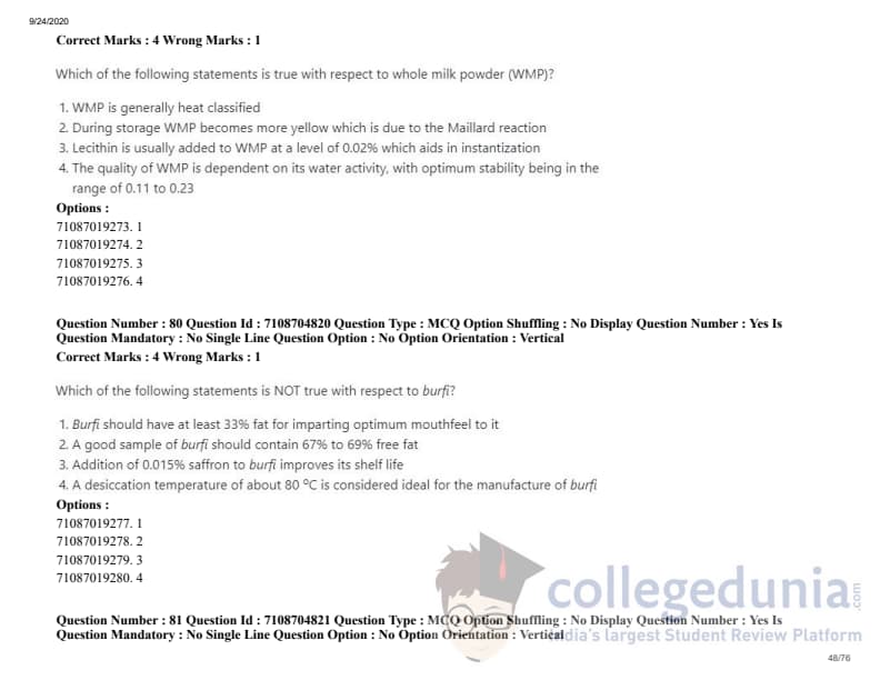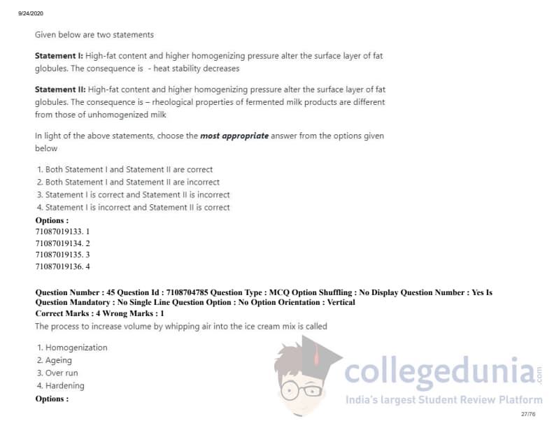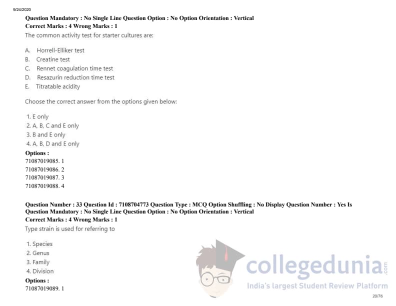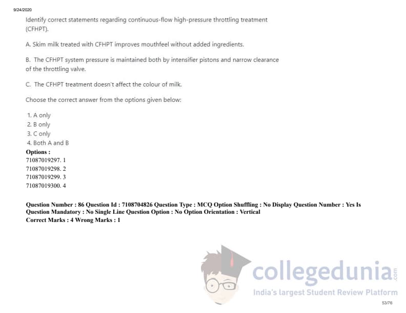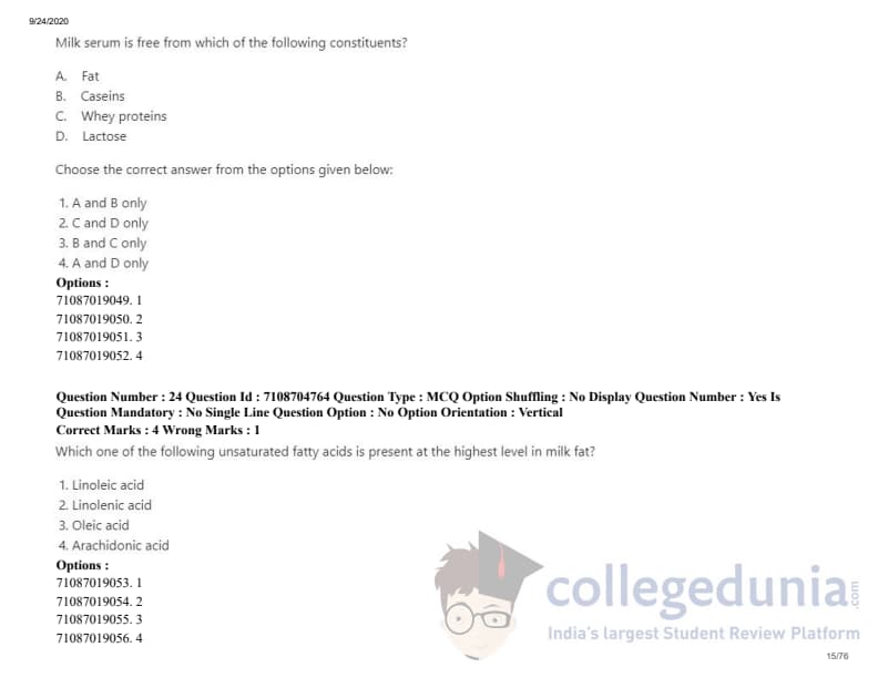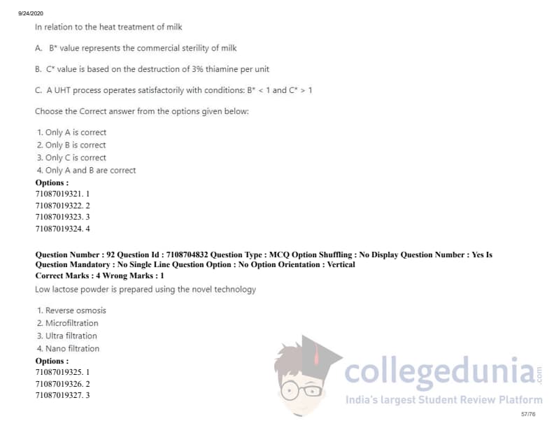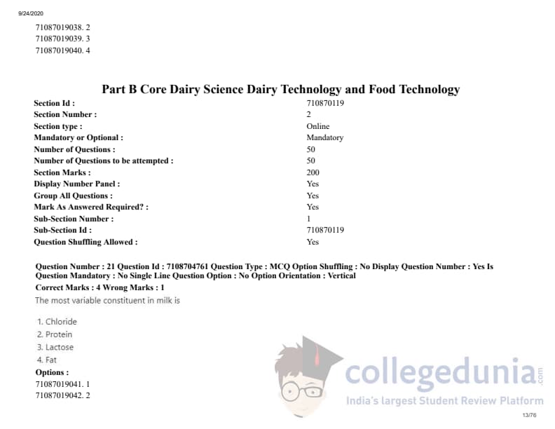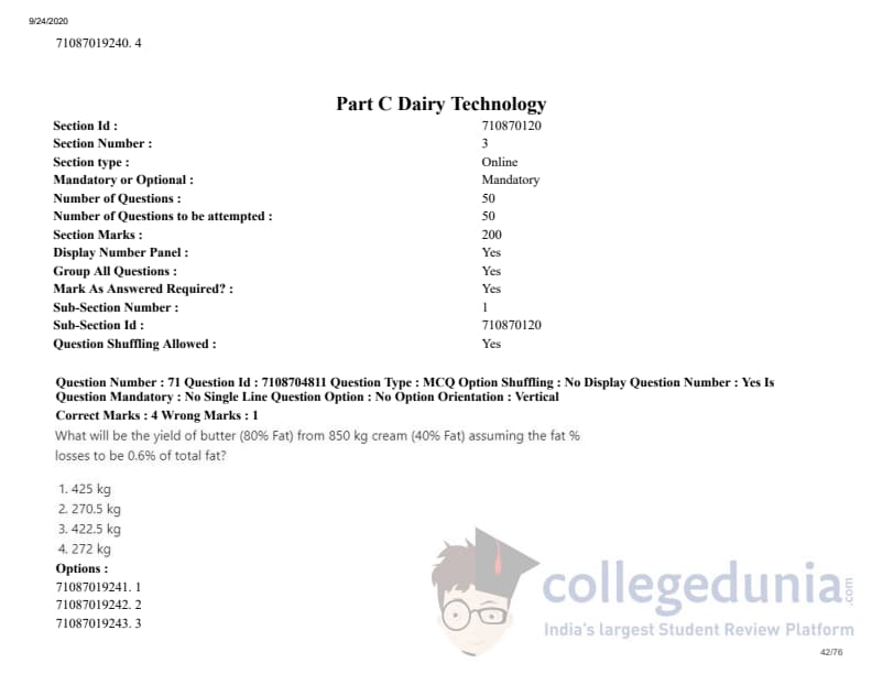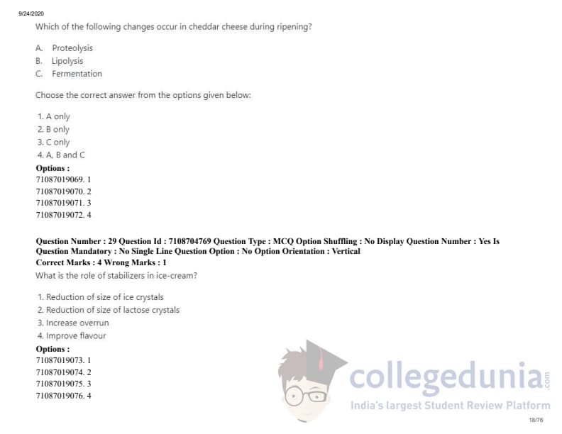 ICAR AIEEA 2020 JRF - DAIRY TECHNOLOGY Question Paper with Answer Key PDFs Afternoon Session
