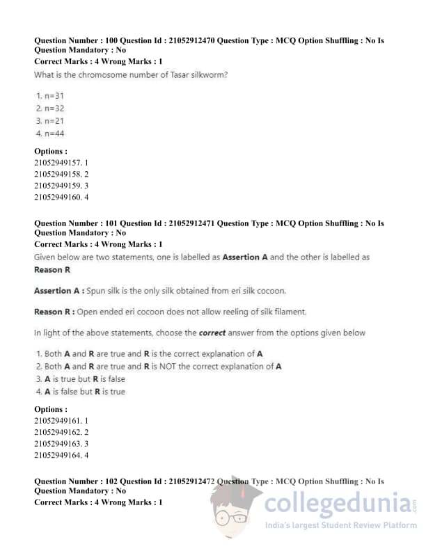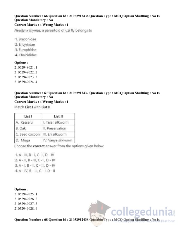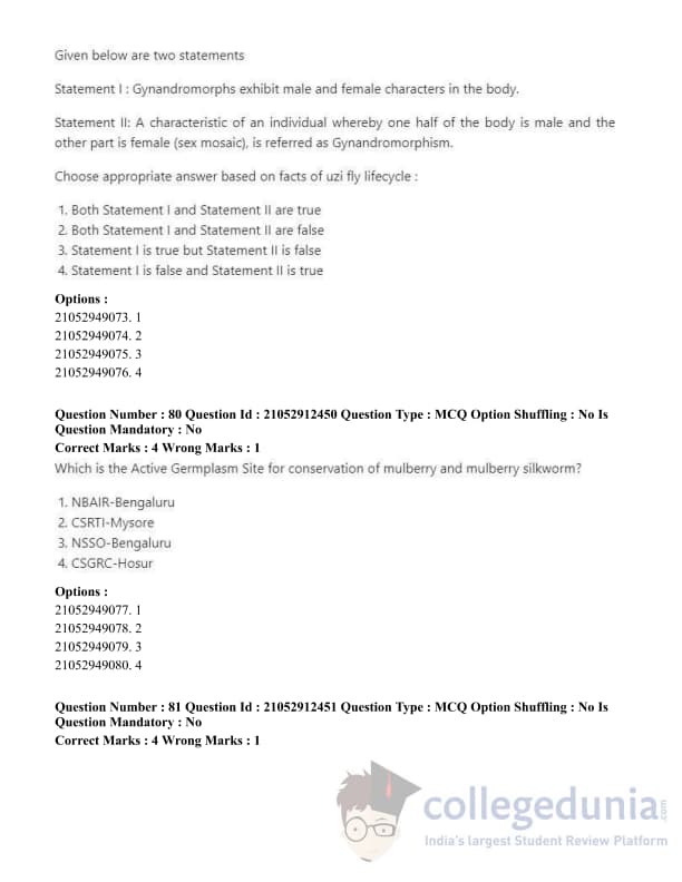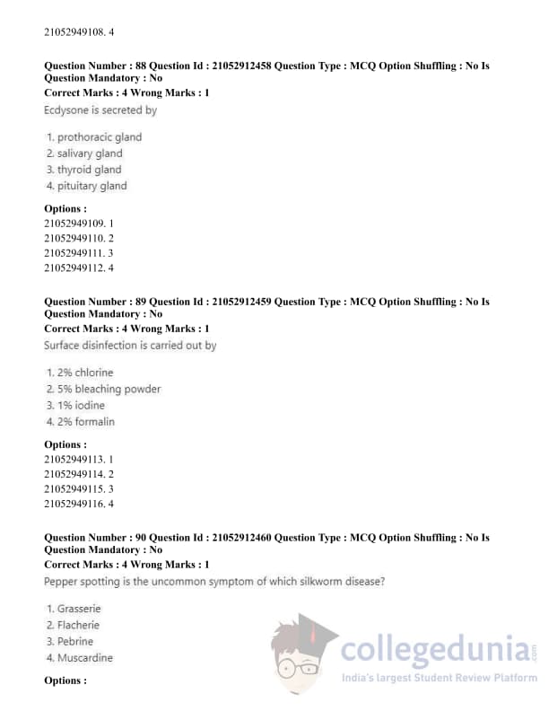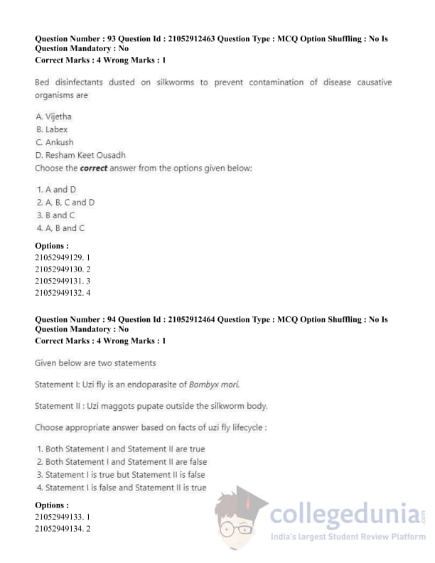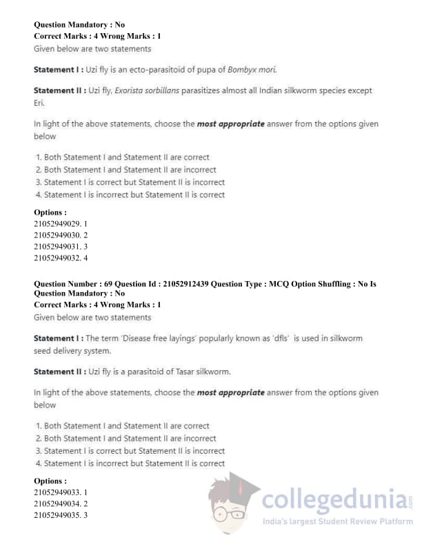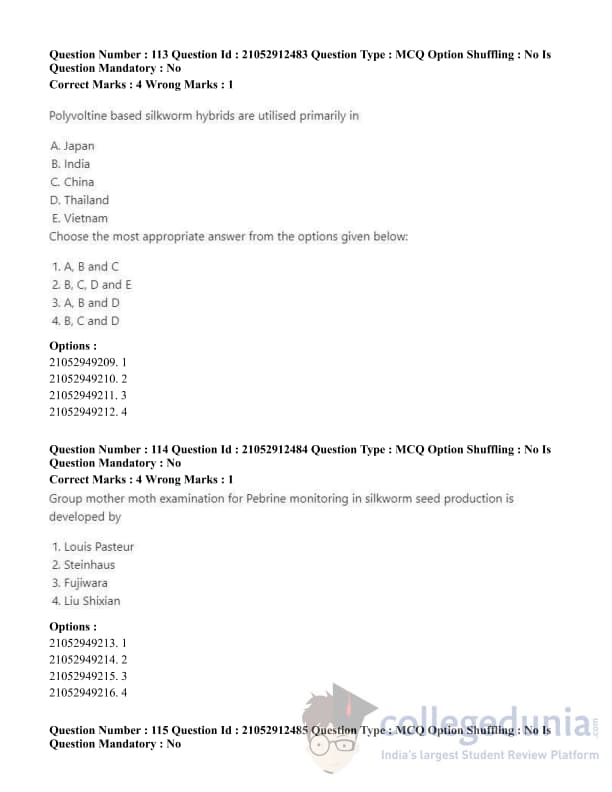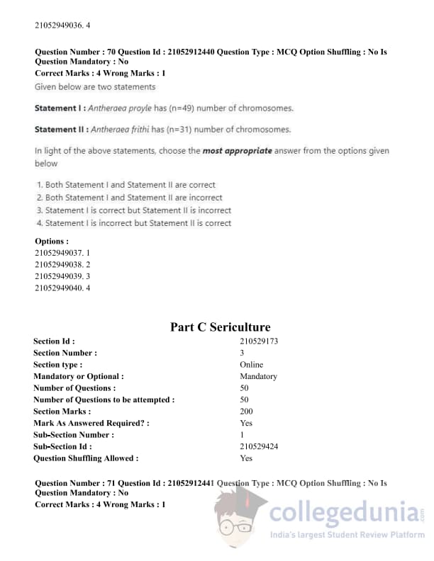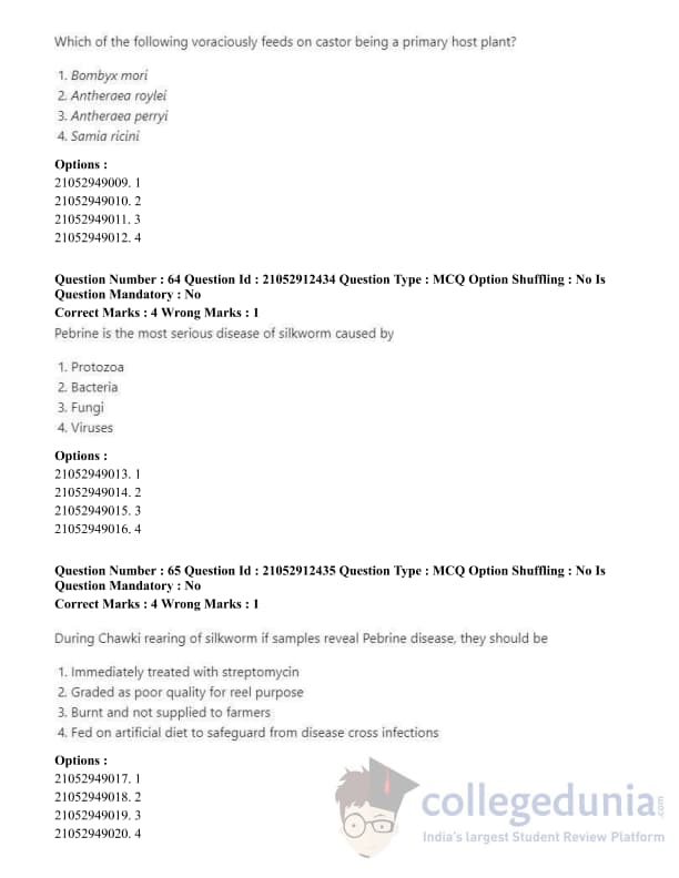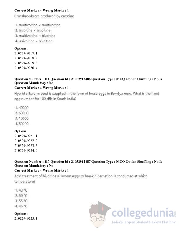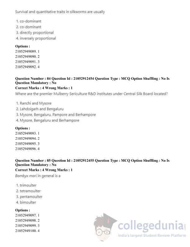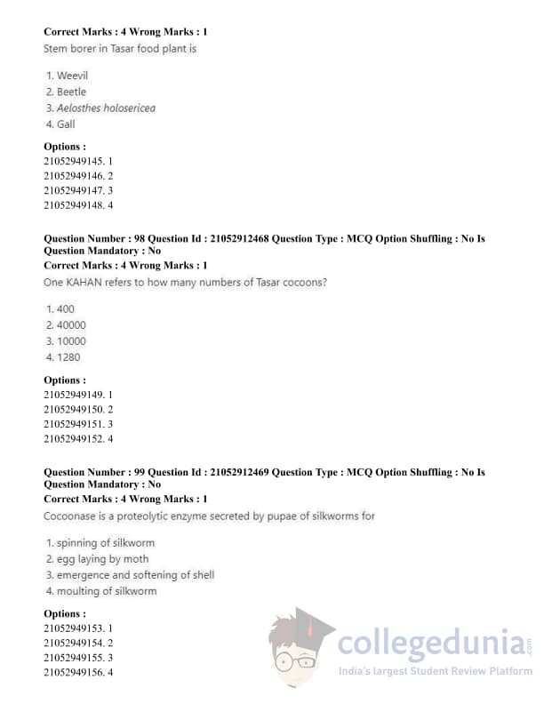 ICAR AIEEA 2020 JRF - SERICULTURE Question Paper with Answer Key PDFs Afternoon Session
